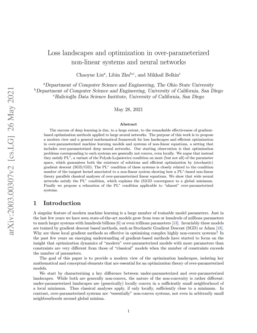 The success of deep learning is due, to a large extent, to the remarkable effectiveness of gradient-based optimization methods applied to large neural networks. The purpose of this work is to propose a modern view and a general mathematical framework for loss landscapes and efficient optimization in over-parameterized machine learning models and systems of non-linear equations, a setting that includes over-parameterized deep neural networks. Our starting observation is that optimization problems corresponding to such systems are generally not convex, even locally. We argue that instead they satisfy PL, a variant of the Polyak-Lojasiewicz condition on most (but not all) of the parameter space, which guarantees both the existence of solutions and efficient optimization by (stochastic) gradient descent (SGD/GD). The PL condition of these systems is closely related to the condition number of the tangent kernel associated to a non-linear system showing how a PL-based non-linear theory parallels classical analyses of over-parameterized linear equations. We show that wide neural networks satisfy the PL condition, which explains the (S)GD convergence to a global minimum. Finally we propose a relaxation of the PL condition applicable to "almost" over-parameterized systems.
