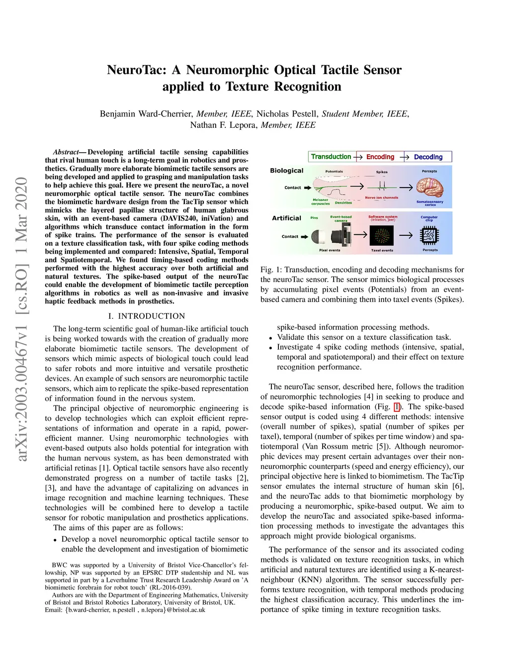 Developing artificial tactile sensing capabilities that rival human touch is a long-term goal in robotics and prosthetics. Gradually more elaborate biomimetic tactile sensors are being developed and applied to grasping and manipulation tasks to help achieve this goal. Here we present the neuroTac, a novel neuromorphic optical tactile sensor. The neuroTac combines the biomimetic hardware design from the TacTip sensor which mimicks the layered papillae structure of human glabrous skin, with an event-based camera (DAVIS240, iniVation) and algorithms which transduce contact information in the form of spike trains. The performance of the sensor is evaluated on a texture classification task, with four spike coding methods being implemented and compared: Intensive, Spatial, Temporal and Spatiotemporal. We found timing-based coding methods performed with the highest accuracy over both artificial and natural textures. The spike-based output of the neuroTac could enable the development of biomimetic tactile perception algorithms in robotics as well as non-invasive and invasive haptic feedback methods in prosthetics.