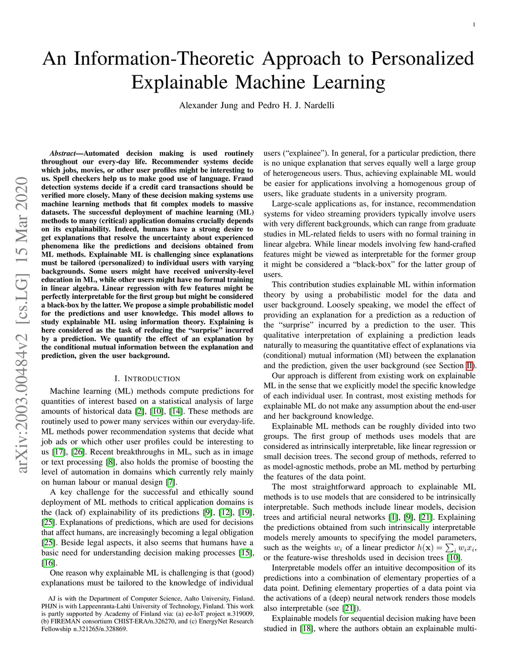 Automated decision making is used routinely throughout our everyday life. Recommender systems decide which jobs, movies, or other user profiles might be interesting to us. Spell checkers help us to make good use of language. Fraud detection systems decide if a credit card transactions should be verified more closely. Many of these decision making systems use machine learning methods that fit complex models to massive datasets. The successful deployment of machine learning (ML) methods to many (critical) application domains crucially depends on its explainability. Indeed, humans have a strong desire to get explanations that resolve the uncertainty about experienced phenomena like the predictions and decisions obtained from ML methods. Explainable ML is challenging since explanations must be tailored (personalized) to individual users with varying backgrounds. Some users might have received university-level education in ML, while other users might have no formal training in linear algebra. Linear regression with few features might be perfectly interpretable for the first group but might be considered a black-box by the latter. We propose a simple probabilistic model for the predictions and user knowledge. This model allows to study explainable ML using information theory. Explaining is here considered as the task of reducing the "surprise" incurred by a prediction. We quantify the effect of an explanation by the conditional mutual information between the explanation and prediction, given the user background.