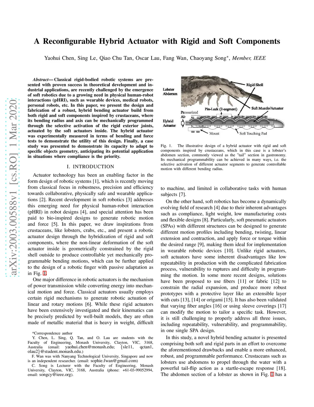 Classical rigid-bodied robotic systems are presented with proven success in theoretical development and industrial applications, are recently challenged by the emergence of soft robotics due to a growing need in physical human-robot interactions (pHRI), such as wearable devices, medical robots, personal robots, etc. In this paper, we present the design and fabrication of a robust, hybrid bending actuator build from both rigid and soft components inspired by crustaceans, where its bending radius and axis can be mechanically programmed through the selective activation of the rigid exterior joints, actuated by the soft actuators inside. The hybrid actuator was experimentally measured in terms of bending and force tests to demonstrate the utility of this design. Finally, a case study was presented to demonstrate its capacity to adapt to specific objects geometry, anticipating its potential application in situations where compliance is the priority.