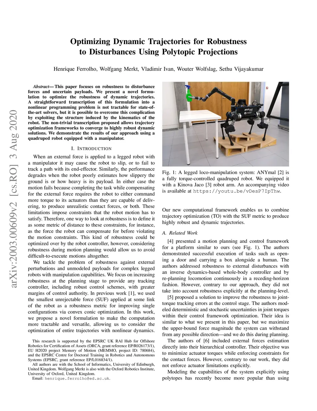 This paper focuses on robustness to disturbance forces and uncertain payloads. We present a novel formulation to optimize the robustness of dynamic trajectories. A straightforward transcription of this formulation into a nonlinear programming problem is not tractable for state-of-the-art solvers, but it is possible to overcome this complication by exploiting the structure induced by the kinematics of the robot. The non-trivial transcription proposed allows trajectory optimization frameworks to converge to highly robust dynamic solutions. We demonstrate the results of our approach using a quadruped robot equipped with a manipulator.
