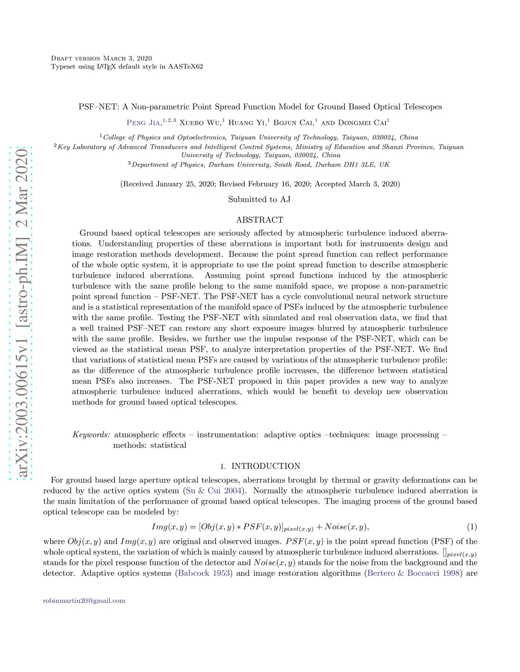 Ground based optical telescopes are seriously affected by atmospheric turbulence induced aberrations. Understanding properties of these aberrations is important both for instruments design and image restoration methods development. Because the point spread function can reflect performance of the whole optic system, it is appropriate to use the point spread function to describe atmospheric turbulence induced aberrations. Assuming point spread functions induced by the atmospheric turbulence with the same profile belong to the same manifold space, we propose a non-parametric point spread function -- PSF-NET. The PSF-NET has a cycle convolutional neural network structure and is a statistical representation of the manifold space of PSFs induced by the atmospheric turbulence with the same profile. Testing the PSF-NET with simulated and real observation data, we find that a well trained PSF--NET can restore any short exposure images blurred by atmospheric turbulence with the same profile. Besides, we further use the impulse response of the PSF-NET, which can be viewed as the statistical mean PSF, to analyze interpretation properties of the PSF-NET. We find that variations of statistical mean PSFs are caused by variations of the atmospheric turbulence profile: as the difference of the atmospheric turbulence profile increases, the difference between statistical mean PSFs also increases. The PSF-NET proposed in this paper provides a new way to analyze atmospheric turbulence induced aberrations, which would be benefit to develop new observation methods for ground based optical telescopes.