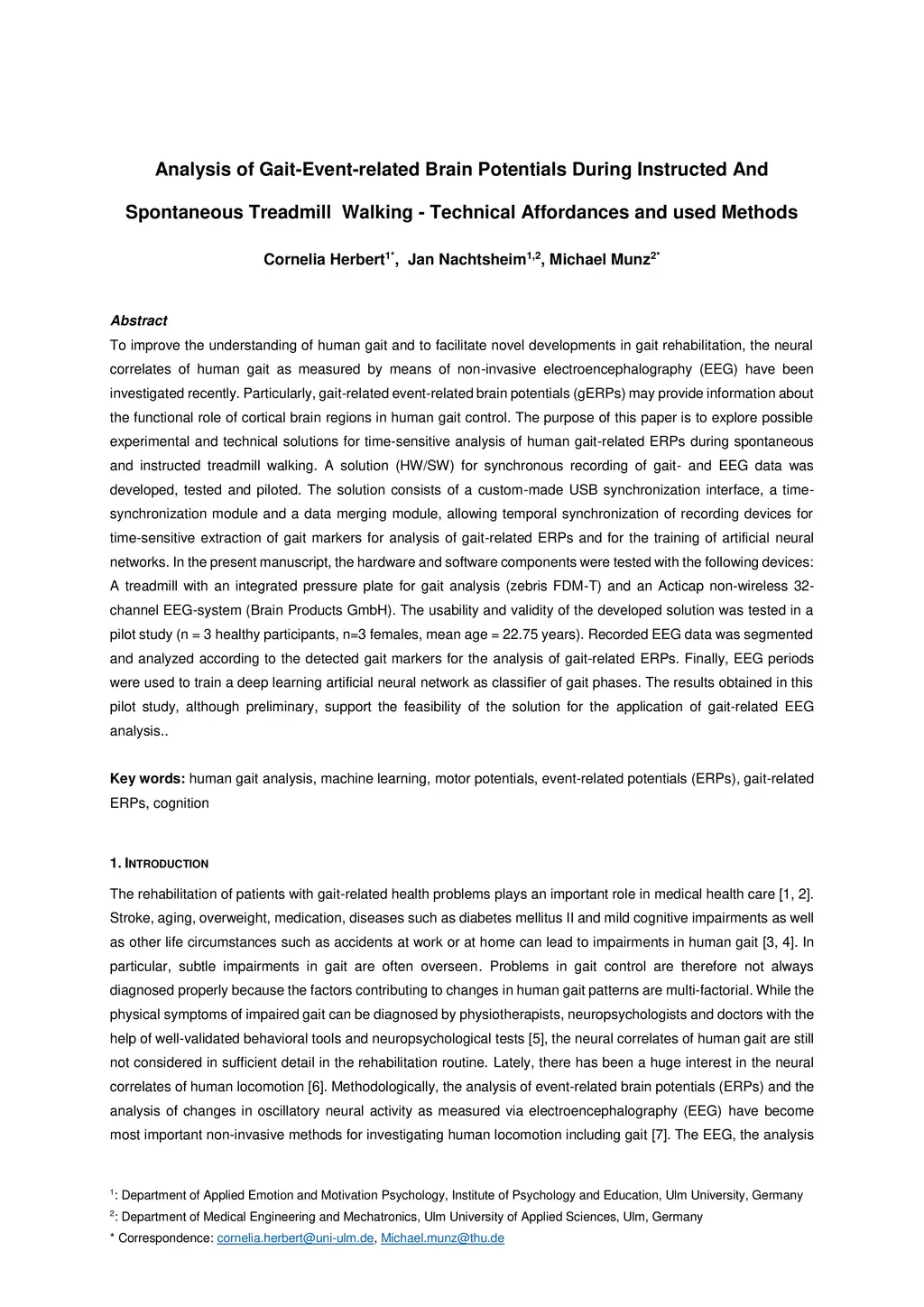To improve the understanding of human gait and to facilitate novel developments in gait rehabilitation, the neural correlates of human gait as measured by means of non-invasive electroencephalography (EEG) have been investigated recently. Particularly, gait-related event-related brain potentials (gERPs) may provide information about the functional role of cortical brain regions in human gait control. The purpose of this paper is to explore possible experimental and technical solutions for time-sensitive analysis of human gait-related ERPs during spontaneous and instructed treadmill walking. A solution (HW/SW) for synchronous recording of gait- and EEG data was developed, tested and piloted. The solution consists of a custom-made USB synchronization interface, a time-synchronization module and a data merging module, allowing temporal synchronization of recording devices for time-sensitive extraction of gait markers for analysis of gait-related ERPs and for the training of artificial neural networks. In the present manuscript, the hardware and software components were tested with the following devices: A treadmill with an integrated pressure plate for gait analysis (zebris FDM-T) and an Acticap non-wireless 32-channel EEG-system (Brain Products GmbH). The usability and validity of the developed solution was tested in a pilot study (n = 3 healthy participants, n=3 females, mean age = 22.75 years). Recorded EEG data was segmented and analyzed according to the detected gait markers for the analysis of gait-related ERPs. Finally, EEG periods were used to train a deep learning artificial neural network as classifier of gait phases. The results obtained in this pilot study, although preliminary, support the feasibility of the solution for the application of gait-related EEG analysis..