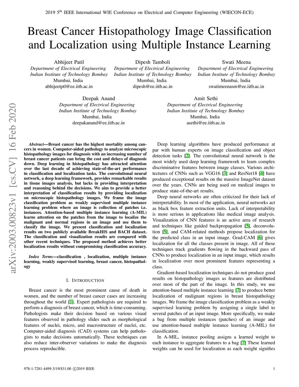 Breast cancer has the highest mortality among cancers in women. Computer-aided pathology to analyze microscopic histopathology images for diagnosis with an increasing number of breast cancer patients can bring the cost and delays of diagnosis down. Deep learning in histopathology has attracted attention over the last decade of achieving state-of-the-art performance in classification and localization tasks. The convolutional neural network, a deep learning framework, provides remarkable results in tissue images analysis, but lacks in providing interpretation and reasoning behind the decisions. We aim to provide a better interpretation of classification results by providing localization on microscopic histopathology images. We frame the image classification problem as weakly supervised multiple instance learning problem where an image is collection of patches i.e. instances. Attention-based multiple instance learning (A-MIL) learns attention on the patches from the image to localize the malignant and normal regions in an image and use them to classify the image. We present classification and localization results on two publicly available BreakHIS and BACH dataset. The classification and visualization results are compared with other recent techniques. The proposed method achieves better localization results without compromising classification accuracy.