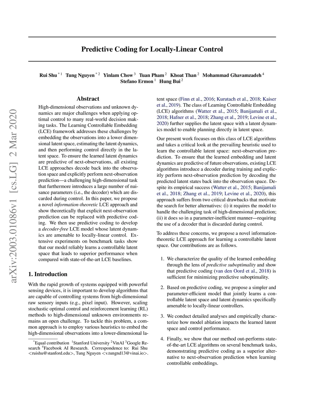 High-dimensional observations and unknown dynamics are major challenges when applying optimal control to many real-world decision making tasks. The Learning Controllable Embedding (LCE) framework addresses these challenges by embedding the observations into a lower dimensional latent space, estimating the latent dynamics, and then performing control directly in the latent space. To ensure the learned latent dynamics are predictive of next-observations, all existing LCE approaches decode back into the observation space and explicitly perform next-observation prediction---a challenging high-dimensional task that furthermore introduces a large number of nuisance parameters (i.e., the decoder) which are discarded during control. In this paper, we propose a novel information-theoretic LCE approach and show theoretically that explicit next-observation prediction can be replaced with predictive coding. We then use predictive coding to develop a decoder-free LCE model whose latent dynamics are amenable to locally-linear control. Extensive experiments on benchmark tasks show that our model reliably learns a controllable latent space that leads to superior performance when compared with state-of-the-art LCE baselines.