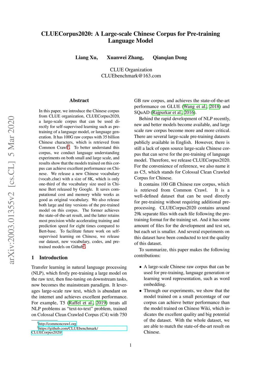 In this paper, we introduce the Chinese corpus from CLUE organization, CLUECorpus2020, a large-scale corpus that can be used directly for self-supervised learning such as pre-training of a language model, or language generation. It has 100G raw corpus with 35 billion Chinese characters, which is retrieved from Common Crawl. To better understand this corpus, we conduct language understanding experiments on both small and large scale, and results show that the models trained on this corpus can achieve excellent performance on Chinese. We release a new Chinese vocabulary with a size of 8K, which is only one-third of the vocabulary size used in Chinese Bert released by Google. It saves computational cost and memory while works as good as original vocabulary. We also release both large and tiny versions of the pre-trained model on this corpus. The former achieves the state-of-the-art result, and the latter retains most precision while accelerating training and prediction speed for eight times compared to Bert-base. To facilitate future work on self-supervised learning on Chinese, we release our dataset, new vocabulary, codes, and pre-trained models on Github.