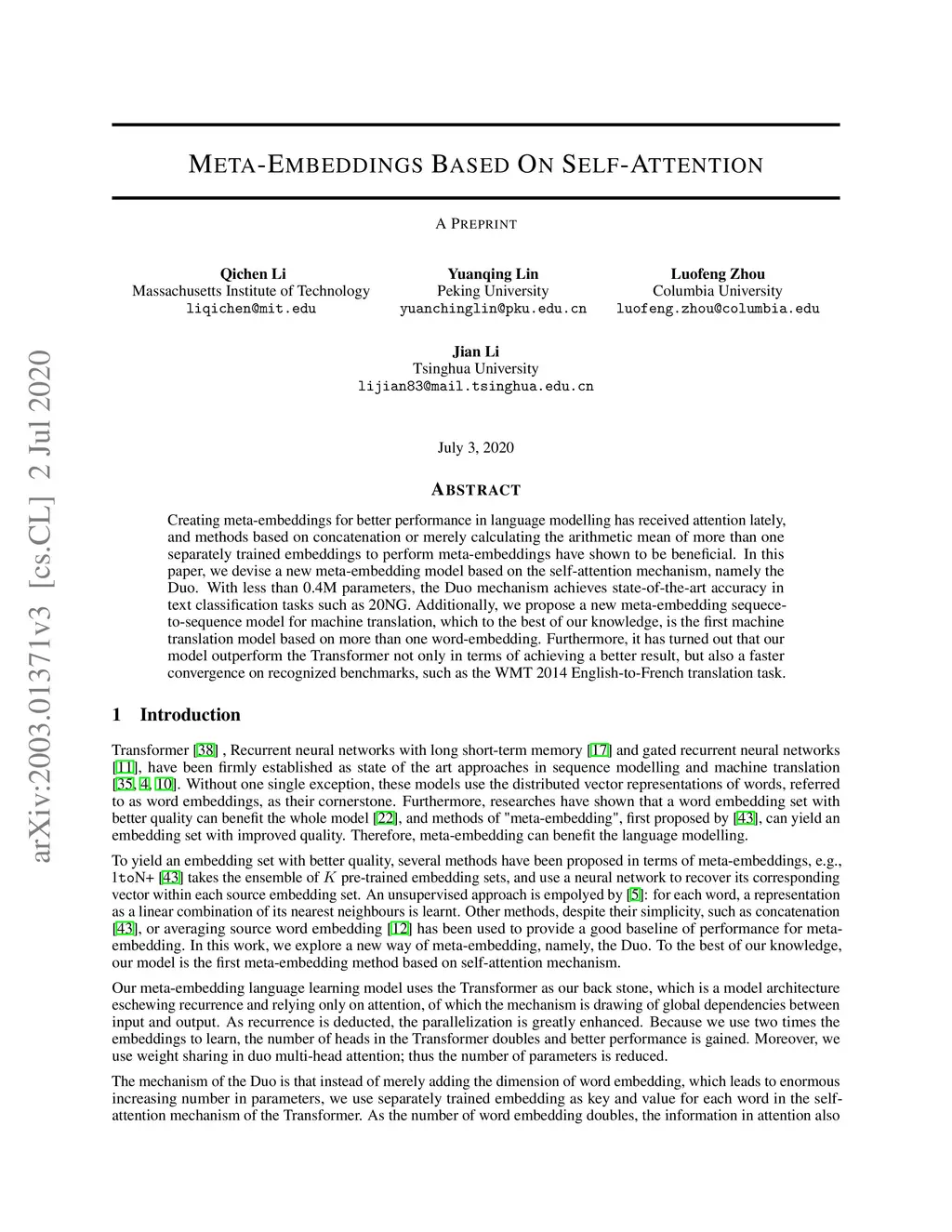 Creating meta-embeddings for better performance in language modelling has received attention lately, and methods based on concatenation or merely calculating the arithmetic mean of more than one separately trained embeddings to perform meta-embeddings have shown to be beneficial. In this paper, we devise a new meta-embedding model based on the self-attention mechanism, namely the Duo. With less than 0.4M parameters, the Duo mechanism achieves state-of-the-art accuracy in text classification tasks such as 20NG. Additionally, we propose a new meta-embedding sequece-to-sequence model for machine translation, which to the best of our knowledge, is the first machine translation model based on more than one word-embedding. Furthermore, it has turned out that our model outperform the Transformer not only in terms of achieving a better result, but also a faster convergence on recognized benchmarks, such as the WMT 2014 English-to-French translation task.