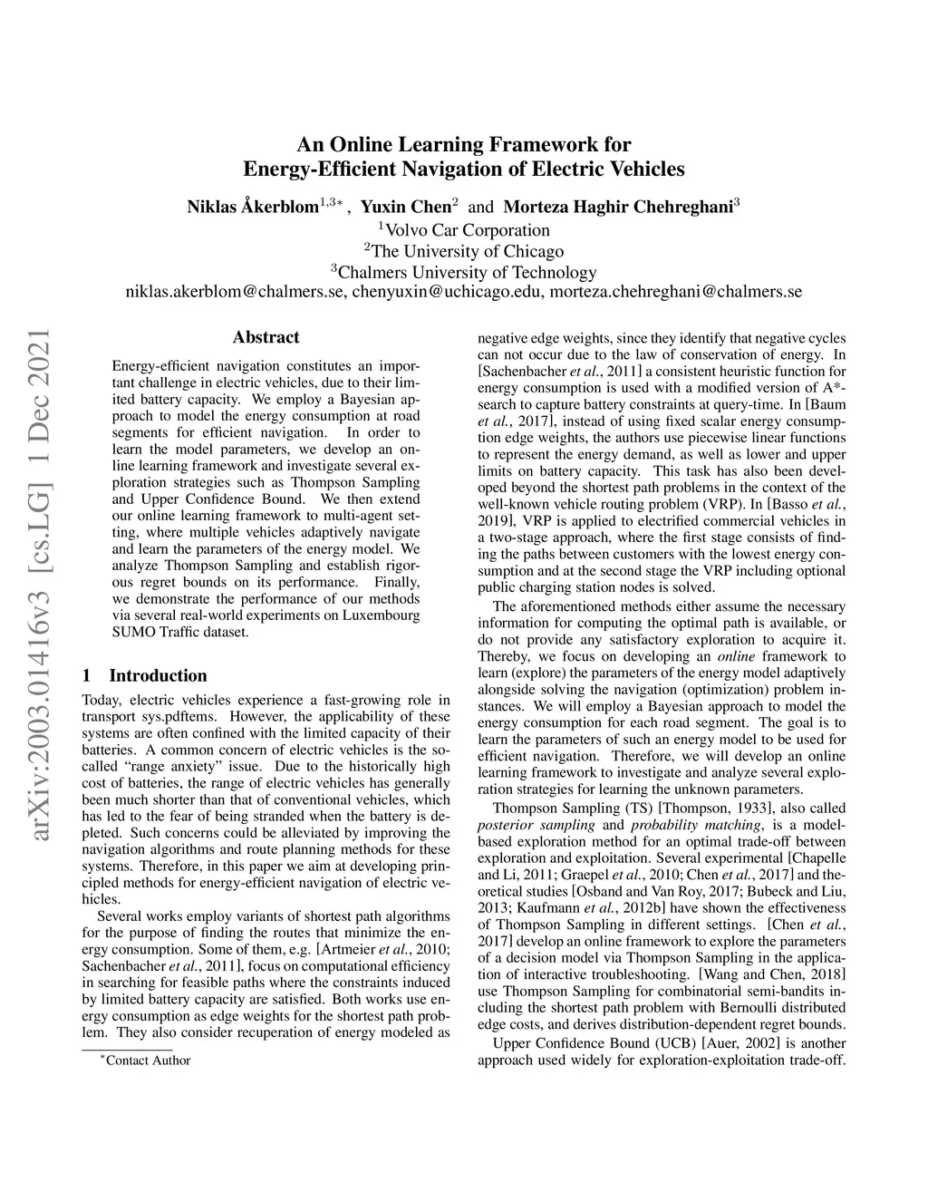 Energy-efficient navigation constitutes an important challenge in electric vehicles, due to their limited battery capacity. We employ a Bayesian approach to model the energy consumption at road segments for efficient navigation. In order to learn the model parameters, we develop an online learning framework and investigate several exploration strategies such as Thompson Sampling and Upper Confidence Bound. We then extend our online learning framework to multi-agent setting, where multiple vehicles adaptively navigate and learn the parameters of the energy model. We analyze Thompson Sampling and establish rigorous regret bounds on its performance. Finally, we demonstrate the performance of our methods via several real-world experiments on Luxembourg SUMO Traffic dataset.
