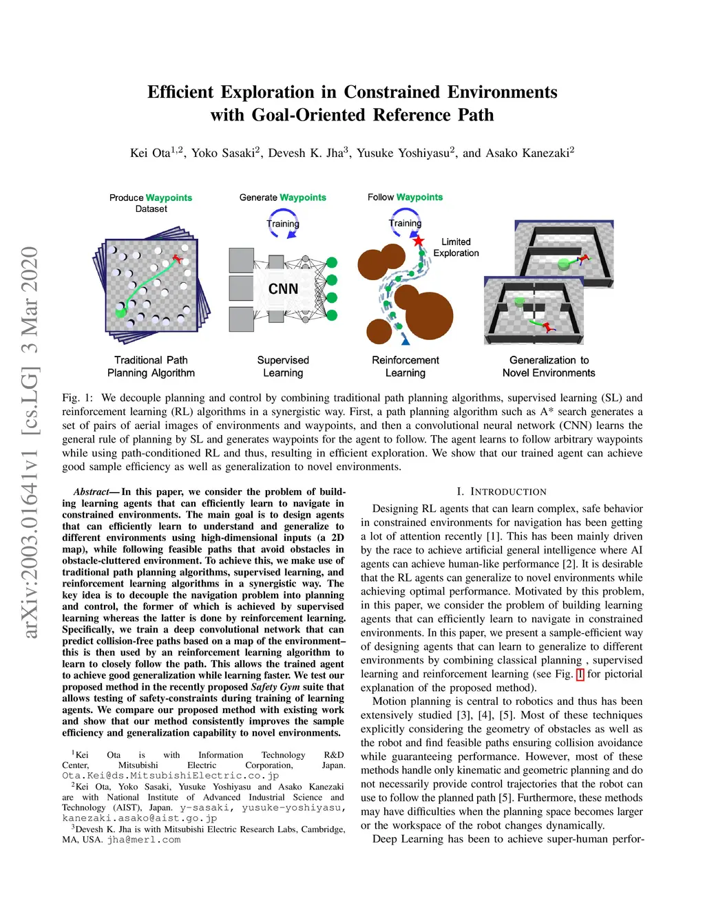 In this paper, we consider the problem of building learning agents that can efficiently learn to navigate in constrained environments. The main goal is to design agents that can efficiently learn to understand and generalize to different environments using high-dimensional inputs (a 2D map), while following feasible paths that avoid obstacles in obstacle-cluttered environment. To achieve this, we make use of traditional path planning algorithms, supervised learning, and reinforcement learning algorithms in a synergistic way. The key idea is to decouple the navigation problem into planning and control, the former of which is achieved by supervised learning whereas the latter is done by reinforcement learning. Specifically, we train a deep convolutional network that can predict collision-free paths based on a map of the environment-- this is then used by a reinforcement learning algorithm to learn to closely follow the path. This allows the trained agent to achieve good generalization while learning faster. We test our proposed method in the recently proposed Safety Gym suite that allows testing of safety-constraints during training of learning agents. We compare our proposed method with existing work and show that our method consistently improves the sample efficiency and generalization capability to novel environments.