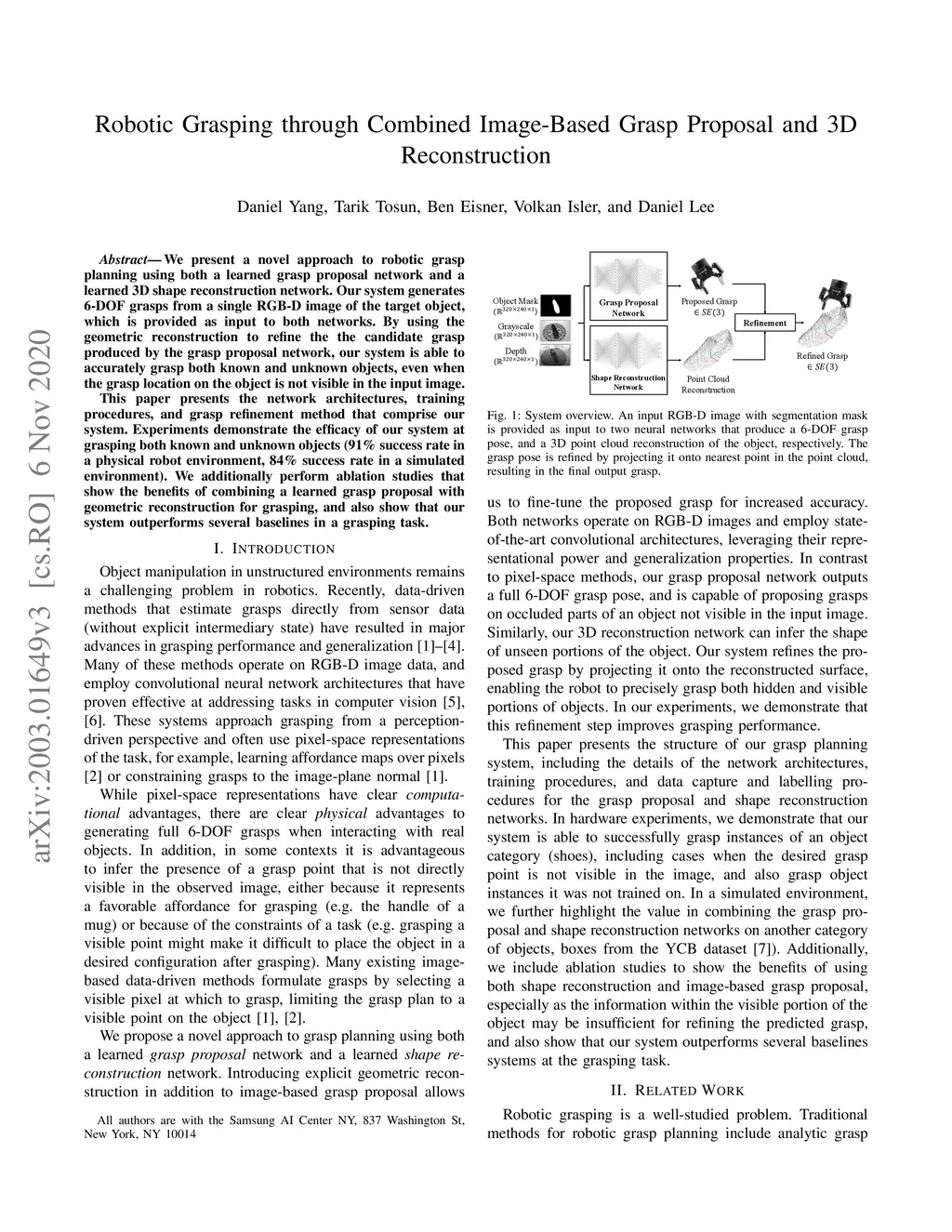 We present a novel approach to robotic grasp planning using both a learned grasp proposal network and a learned 3D shape reconstruction network. Our system generates 6-DOF grasps from a single RGB-D image of the target object, which is provided as input to both networks. By using the geometric reconstruction to refine the the candidate grasp produced by the grasp proposal network, our system is able to accurately grasp both known and unknown objects, even when the grasp location on the object is not visible in the input image. This paper presents the network architectures, training procedures, and grasp refinement method that comprise our system. Experiments demonstrate the efficacy of our system at grasping both known and unknown objects (91% success rate in a physical robot environment, 84% success rate in a simulated environment). We additionally perform ablation studies that show the benefits of combining a learned grasp proposal with geometric reconstruction for grasping, and also show that our system outperforms several baselines in a grasping task.