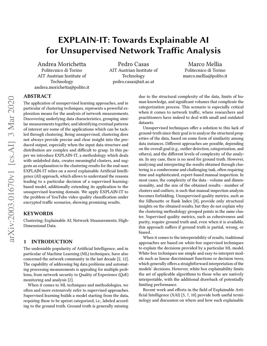 The application of unsupervised learning approaches, and in particular of clustering techniques, represents a powerful exploration means for the analysis of network measurements. Discovering underlying data characteristics, grouping similar measurements together, and identifying eventual patterns of interest are some of the applications which can be tackled through clustering. Being unsupervised, clustering does not always provide precise and clear insight into the produced output, especially when the input data structure and distribution are complex and difficult to grasp. In this paper we introduce EXPLAIN-IT, a methodology which deals with unlabeled data, creates meaningful clusters, and suggests an explanation to the clustering results for the end-user. EXPLAIN-IT relies on a novel explainable Artificial Intelligence (AI) approach, which allows to understand the reasons leading to a particular decision of a supervised learning-based model, additionally extending its application to the unsupervised learning domain. We apply EXPLAIN-IT to the problem of YouTube video quality classification under encrypted traffic scenarios, showing promising results.