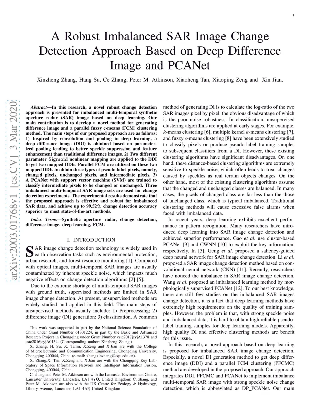 In this research, a novel robust change detection approach is presented for imbalanced multi-temporal synthetic aperture radar (SAR) image based on deep learning. Our main contribution is to develop a novel method for generating difference image and a parallel fuzzy c-means (FCM) clustering method. The main steps of our proposed approach are as follows: 1) Inspired by convolution and pooling in deep learning, a deep difference image (DDI) is obtained based on parameterized pooling leading to better speckle suppression and feature enhancement than traditional difference images. 2) Two different parameter Sigmoid nonlinear mapping are applied to the DDI to get two mapped DDIs. Parallel FCM are utilized on these two mapped DDIs to obtain three types of pseudo-label pixels, namely, changed pixels, unchanged pixels, and intermediate pixels. 3) A PCANet with support vector machine (SVM) are trained to classify intermediate pixels to be changed or unchanged. Three imbalanced multi-temporal SAR image sets are used for change detection experiments. The experimental results demonstrate that the proposed approach is effective and robust for imbalanced SAR data, and achieve up to 99.52% change detection accuracy superior to most state-of-the-art methods.