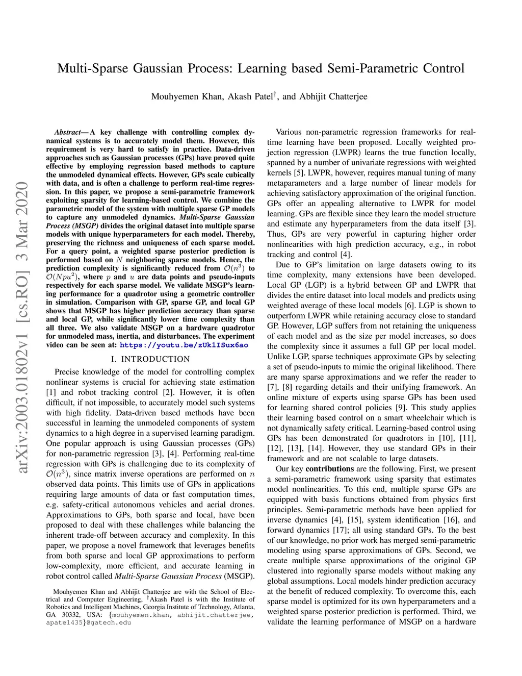 A key challenge with controlling complex dynamical systems is to accurately model them. However, this requirement is very hard to satisfy in practice. Data-driven approaches such as Gaussian processes (GPs) have proved quite effective by employing regression based methods to capture the unmodeled dynamical effects. However, GPs scale cubically with data, and is often a challenge to perform real-time regression. In this paper, we propose a semi-parametric framework exploiting sparsity for learning-based control. We combine the parametric model of the system with multiple sparse GP models to capture any unmodeled dynamics. Multi-Sparse Gaussian Process (MSGP) divides the original dataset into multiple sparse models with unique hyperparameters for each model. Thereby, preserving the richness and uniqueness of each sparse model. For a query point, a weighted sparse posterior prediction is performed based on neighboring sparse models. Hence, the prediction complexity is significantly reduced from to , where and are data points and pseudo-inputs respectively for each sparse model. We validate MSGP's learning performance for a quadrotor using a geometric controller in simulation. Comparison with GP, sparse GP, and local GP shows that MSGP has higher prediction accuracy than sparse and local GP, while significantly lower time complexity than all three. We also validate MSGP on a hardware quadrotor for unmodeled mass, inertia, and disturbances. The experiment video can be seen at: https://youtu.be/zUk1ISux6ao