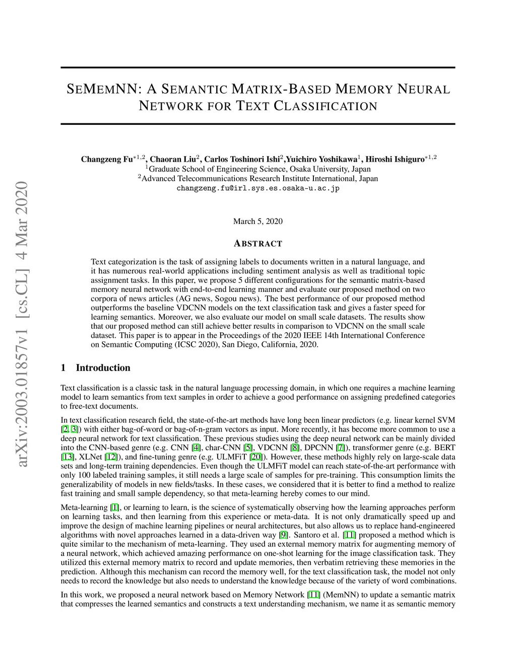 Text categorization is the task of assigning labels to documents written in a natural language, and it has numerous real-world applications including sentiment analysis as well as traditional topic assignment tasks. In this paper, we propose 5 different configurations for the semantic matrix-based memory neural network with end-to-end learning manner and evaluate our proposed method on two corpora of news articles (AG news, Sogou news). The best performance of our proposed method outperforms the baseline VDCNN models on the text classification task and gives a faster speed for learning semantics. Moreover, we also evaluate our model on small scale datasets. The results show that our proposed method can still achieve better results in comparison to VDCNN on the small scale dataset. This paper is to appear in the Proceedings of the 2020 IEEE 14th International Conference on Semantic Computing (ICSC 2020), San Diego, California, 2020.