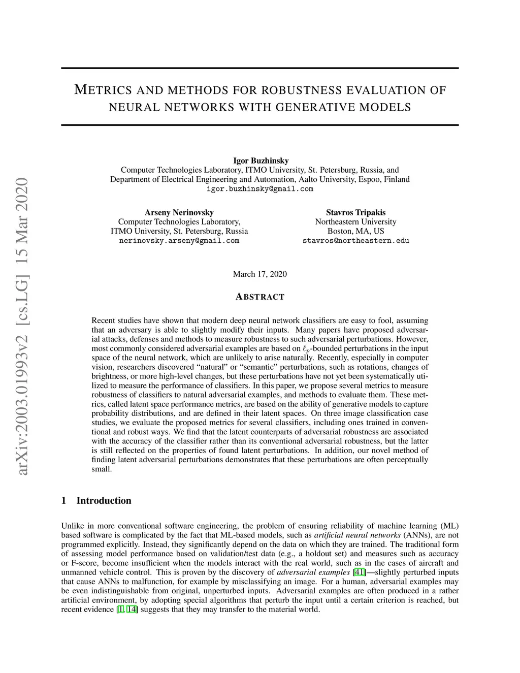 Recent studies have shown that modern deep neural network classifiers are easy to fool, assuming that an adversary is able to slightly modify their inputs. Many papers have proposed adversarial attacks, defenses and methods to measure robustness to such adversarial perturbations. However, most commonly considered adversarial examples are based on -bounded perturbations in the input space of the neural network, which are unlikely to arise naturally. Recently, especially in computer vision, researchers discovered "natural" or "semantic" perturbations, such as rotations, changes of brightness, or more high-level changes, but these perturbations have not yet been systematically utilized to measure the performance of classifiers. In this paper, we propose several metrics to measure robustness of classifiers to natural adversarial examples, and methods to evaluate them. These metrics, called latent space performance metrics, are based on the ability of generative models to capture probability distributions, and are defined in their latent spaces. On three image classification case studies, we evaluate the proposed metrics for several classifiers, including ones trained in conventional and robust ways. We find that the latent counterparts of adversarial robustness are associated with the accuracy of the classifier rather than its conventional adversarial robustness, but the latter is still reflected on the properties of found latent perturbations. In addition, our novel method of finding latent adversarial perturbations demonstrates that these perturbations are often perceptually small.