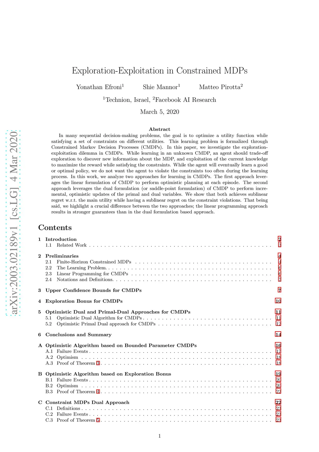 In many sequential decision-making problems, the goal is to optimize a utility function while satisfying a set of constraints on different utilities. This learning problem is formalized through Constrained Markov Decision Processes (CMDPs). In this paper, we investigate the exploration-exploitation dilemma in CMDPs. While learning in an unknown CMDP, an agent should trade-off exploration to discover new information about the MDP, and exploitation of the current knowledge to maximize the reward while satisfying the constraints. While the agent will eventually learn a good or optimal policy, we do not want the agent to violate the constraints too often during the learning process. In this work, we analyze two approaches for learning in CMDPs. The first approach leverages the linear formulation of CMDP to perform optimistic planning at each episode. The second approach leverages the dual formulation (or saddle-point formulation) of CMDP to perform incremental, optimistic updates of the primal and dual variables. We show that both achieves sublinear regret w.r.t.\ the main utility while having a sublinear regret on the constraint violations. That being said, we highlight a crucial difference between the two approaches; the linear programming approach results in stronger guarantees than in the dual formulation based approach.