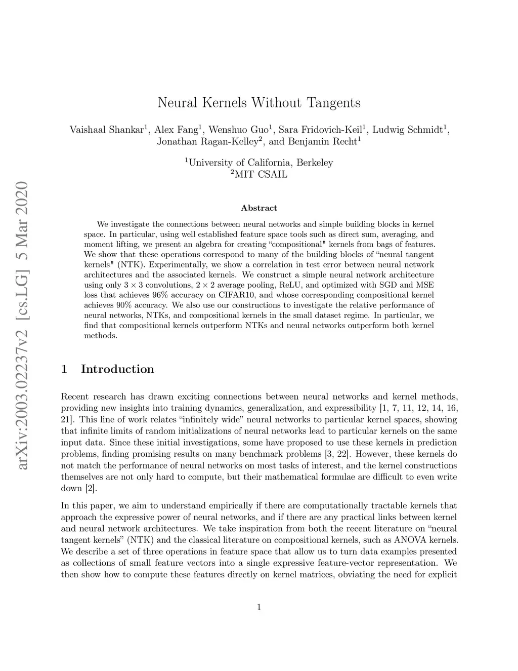 We investigate the connections between neural networks and simple building blocks in kernel space. In particular, using well established feature space tools such as direct sum, averaging, and moment lifting, we present an algebra for creating "compositional" kernels from bags of features. We show that these operations correspond to many of the building blocks of "neural tangent kernels (NTK)". Experimentally, we show that there is a correlation in test error between neural network architectures and the associated kernels. We construct a simple neural network architecture using only 3x3 convolutions, 2x2 average pooling, ReLU, and optimized with SGD and MSE loss that achieves 96% accuracy on CIFAR10, and whose corresponding compositional kernel achieves 90% accuracy. We also use our constructions to investigate the relative performance of neural networks, NTKs, and compositional kernels in the small dataset regime. In particular, we find that compositional kernels outperform NTKs and neural networks outperform both kernel methods.