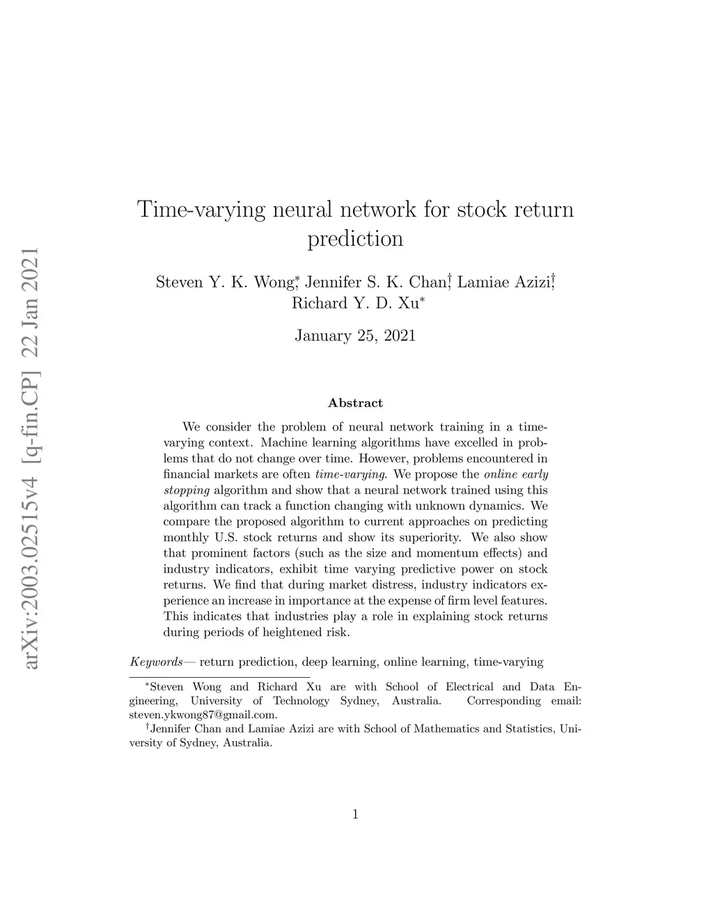We consider the problem of neural network training in a time-varying context. Machine learning algorithms have excelled in problems that do not change over time. However, problems encountered in financial markets are often time-varying. We propose the online early stopping algorithm and show that a neural network trained using this algorithm can track a function changing with unknown dynamics. We compare the proposed algorithm to current approaches on predicting monthly U.S. stock returns and show its superiority. We also show that prominent factors (such as the size and momentum effects) and industry indicators, exhibit time varying stock return predictiveness. We find that during market distress, industry indicators experience an increase in importance at the expense of firm level features. This indicates that industries play a role in explaining stock returns during periods of heightened risk.
