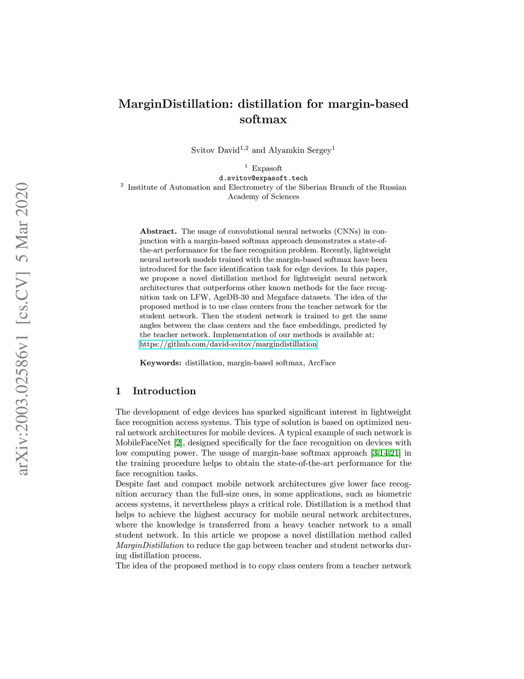 MarginDistillation: distillation for margin-based softmax