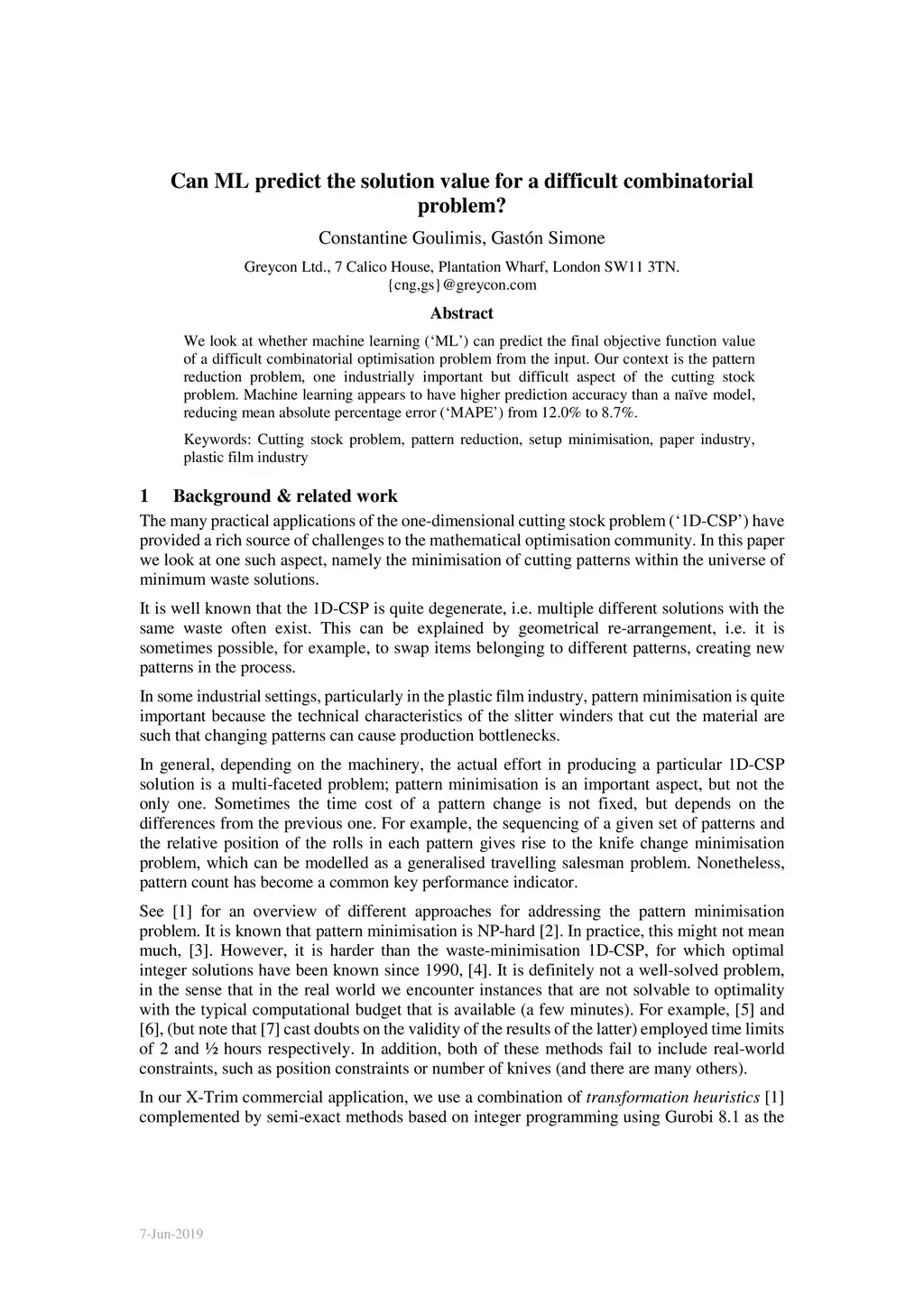 We look at whether machine learning can predict the final objective function value of a difficult combinatorial optimisation problem from the input. Our context is the pattern reduction problem, one industrially important but difficult aspect of the cutting stock problem. Machine learning appears to have higher prediction accuracy than a na\"ive model, reducing mean absolute percentage error (MAPE) from 12.0% to 8.7%.