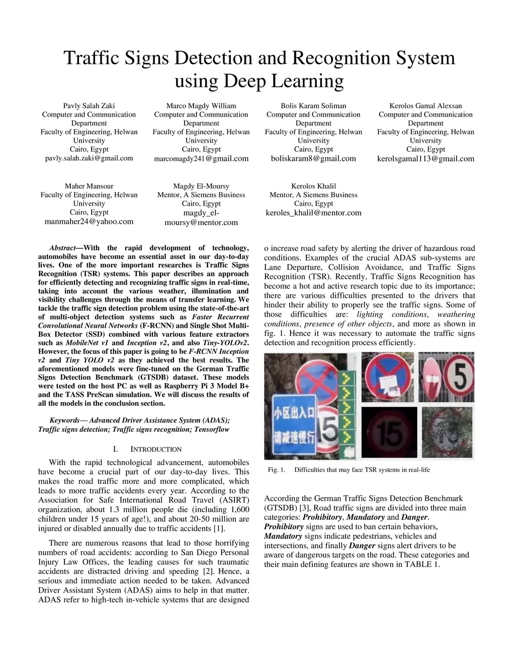 With the rapid development of technology, automobiles have become an essential asset in our day-to-day lives. One of the more important researches is Traffic Signs Recognition (TSR) systems. This paper describes an approach for efficiently detecting and recognizing traffic signs in real-time, taking into account the various weather, illumination and visibility challenges through the means of transfer learning. We tackle the traffic sign detection problem using the state-of-the-art of multi-object detection systems such as Faster Recurrent Convolutional Neural Networks (F-RCNN) and Single Shot Multi- Box Detector (SSD) combined with various feature extractors such as MobileNet v1 and Inception v2, and also Tiny-YOLOv2. However, the focus of this paper is going to be F-RCNN Inception v2 and Tiny YOLO v2 as they achieved the best results. The aforementioned models were fine-tuned on the German Traffic Signs Detection Benchmark (GTSDB) dataset. These models were tested on the host PC as well as Raspberry Pi 3 Model B+ and the TASS PreScan simulation. We will discuss the results of all the models in the conclusion section.