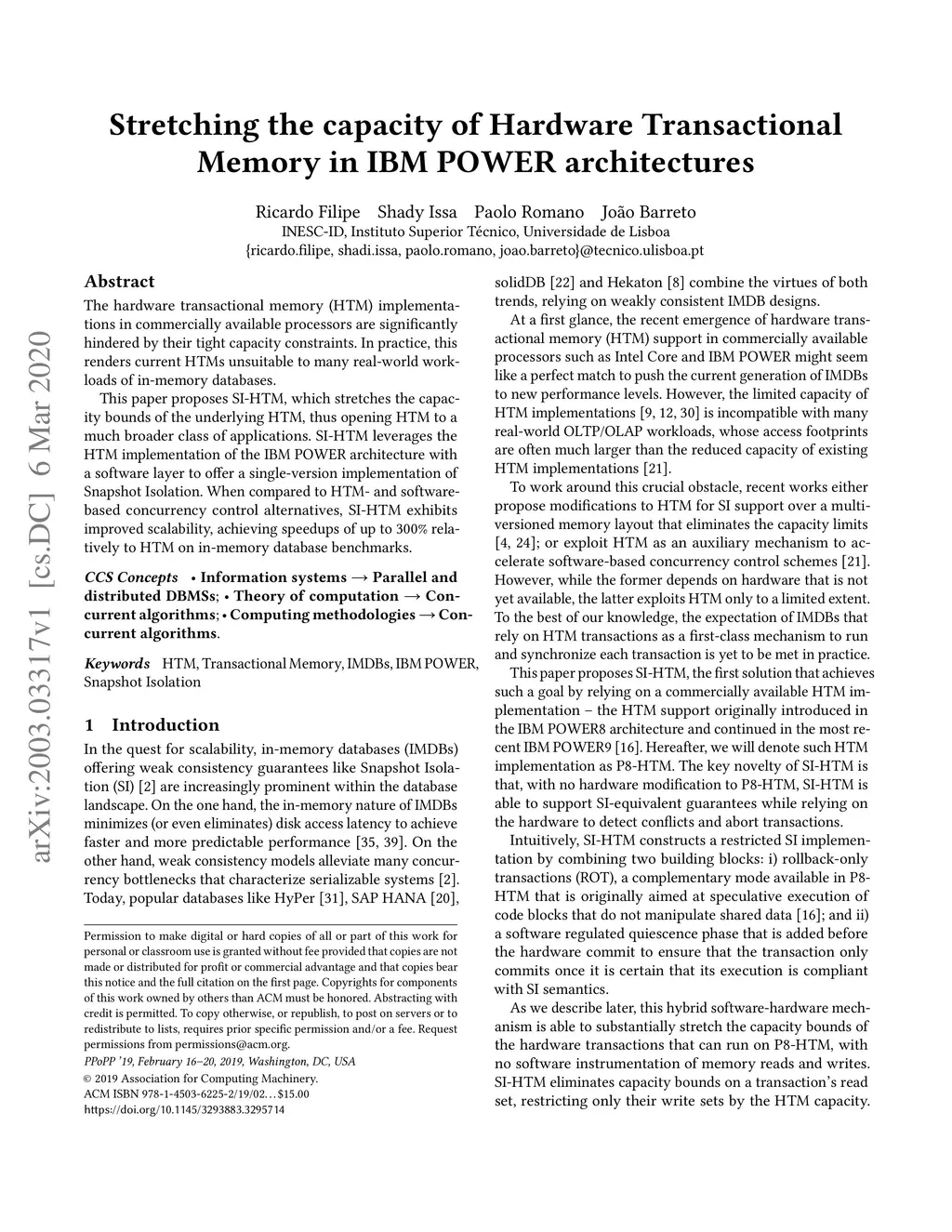 The hardware transactional memory (HTM) implementations in commercially available processors are significantly hindered by their tight capacity constraints. In practice, this renders current HTMs unsuitable to many real-world workloads of in-memory databases. This paper proposes SI-HTM, which stretches the capacity bounds of the underlying HTM, thus opening HTM to a much broader class of applications. SI-HTM leverages the HTM implementation of the IBM POWER architecture with a software layer to offer a single-version implementation of Snapshot Isolation. When compared to HTM- and software-based concurrency control alternatives, SI-HTM exhibits improved scalability, achieving speedups of up to 300% relatively to HTM on in-memory database benchmarks.