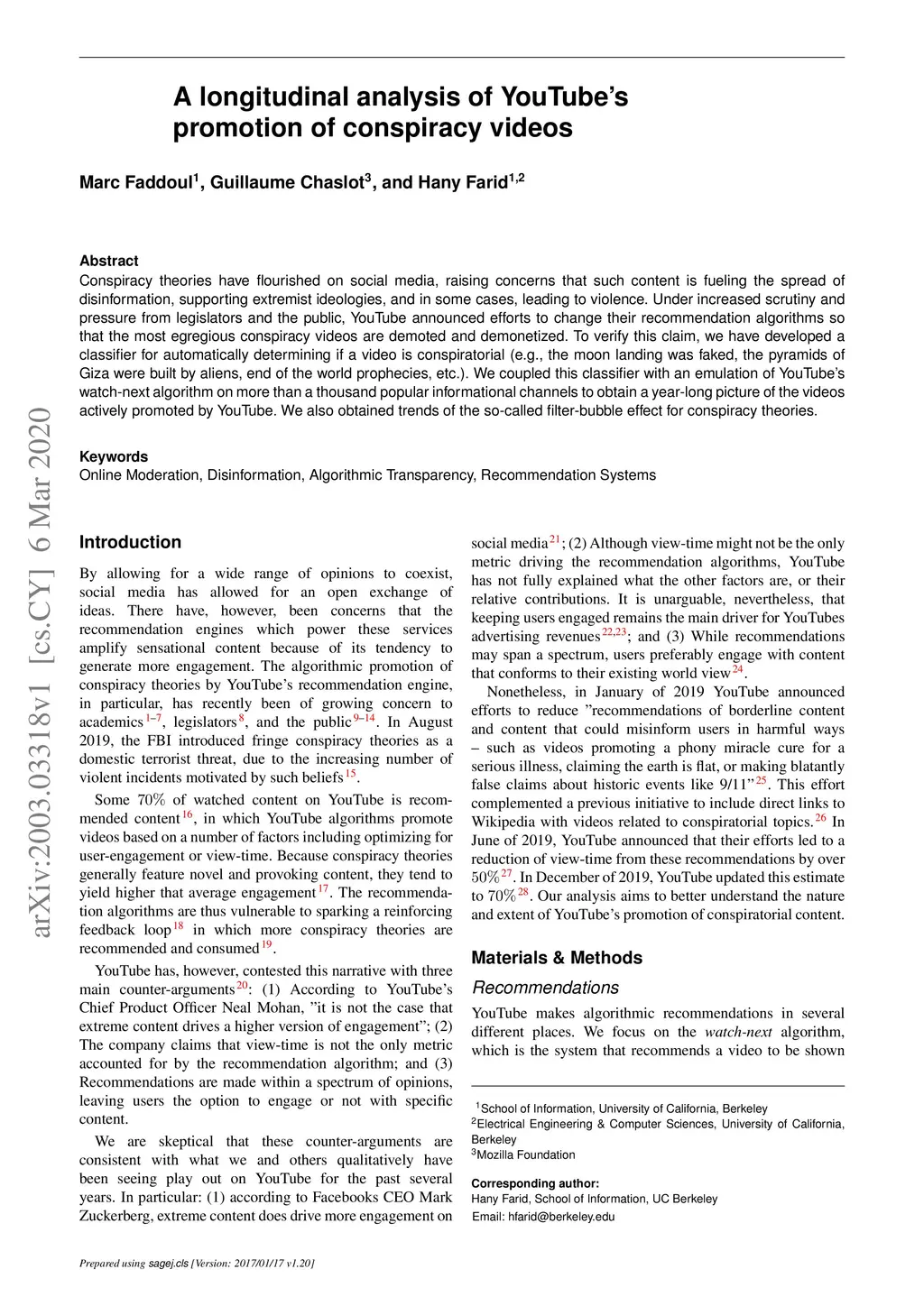 Conspiracy theories have flourished on social media, raising concerns that such content is fueling the spread of disinformation, supporting extremist ideologies, and in some cases, leading to violence. Under increased scrutiny and pressure from legislators and the public, YouTube announced efforts to change their recommendation algorithms so that the most egregious conspiracy videos are demoted and demonetized. To verify this claim, we have developed a classifier for automatically determining if a video is conspiratorial (e.g., the moon landing was faked, the pyramids of Giza were built by aliens, end of the world prophecies, etc.). We coupled this classifier with an emulation of YouTube's watch-next algorithm on more than a thousand popular informational channels to obtain a year-long picture of the videos actively promoted by YouTube. We also obtained trends of the so-called filter-bubble effect for conspiracy theories.
