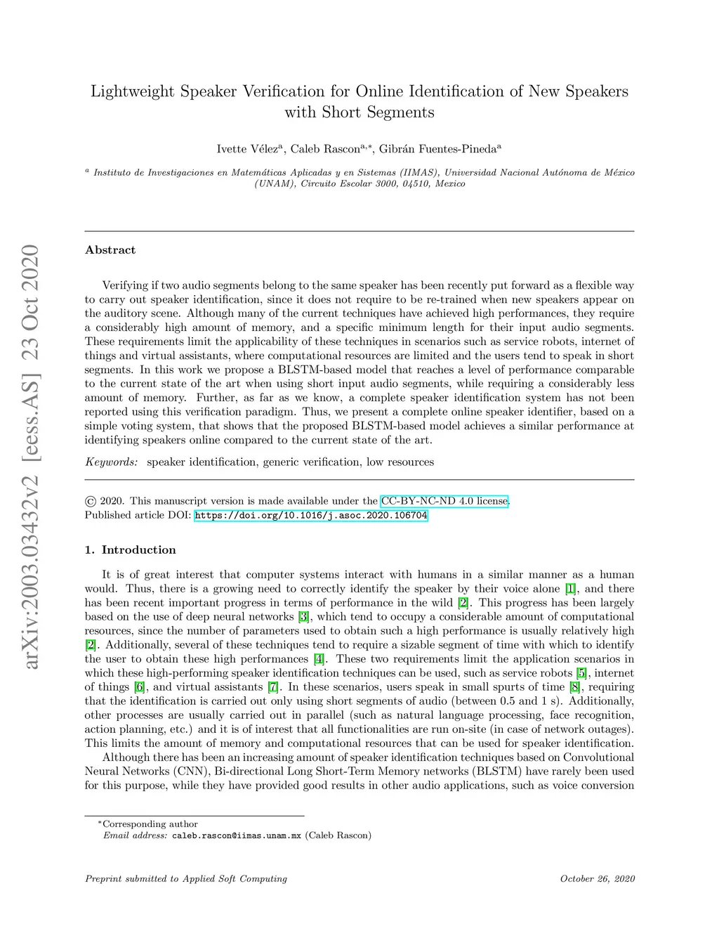 Verifying if two audio segments belong to the same speaker has been recently put forward as a flexible way to carry out speaker identification, since it does not require to be re-trained when new speakers appear on the auditory scene. Although many of the current techniques have achieved high performances, they require a considerably high amount of memory, and a specific minimum length for their input audio segments. These requirements limit the applicability of these techniques in scenarios such as service robots, internet of things and virtual assistants, where computational resources are limited and the users tend to speak in short segments. In this work we propose a BLSTM-based model that reaches a level of performance comparable to the current state of the art when using short input audio segments, while requiring a considerably less amount of memory. Further, as far as we know, a complete speaker identification system has not been reported using this verification paradigm. Thus, we present a complete online speaker identifier, based on a simple voting system, that shows that the proposed BLSTM-based model achieves a similar performance at identifying speakers online compared to the current state of the art.