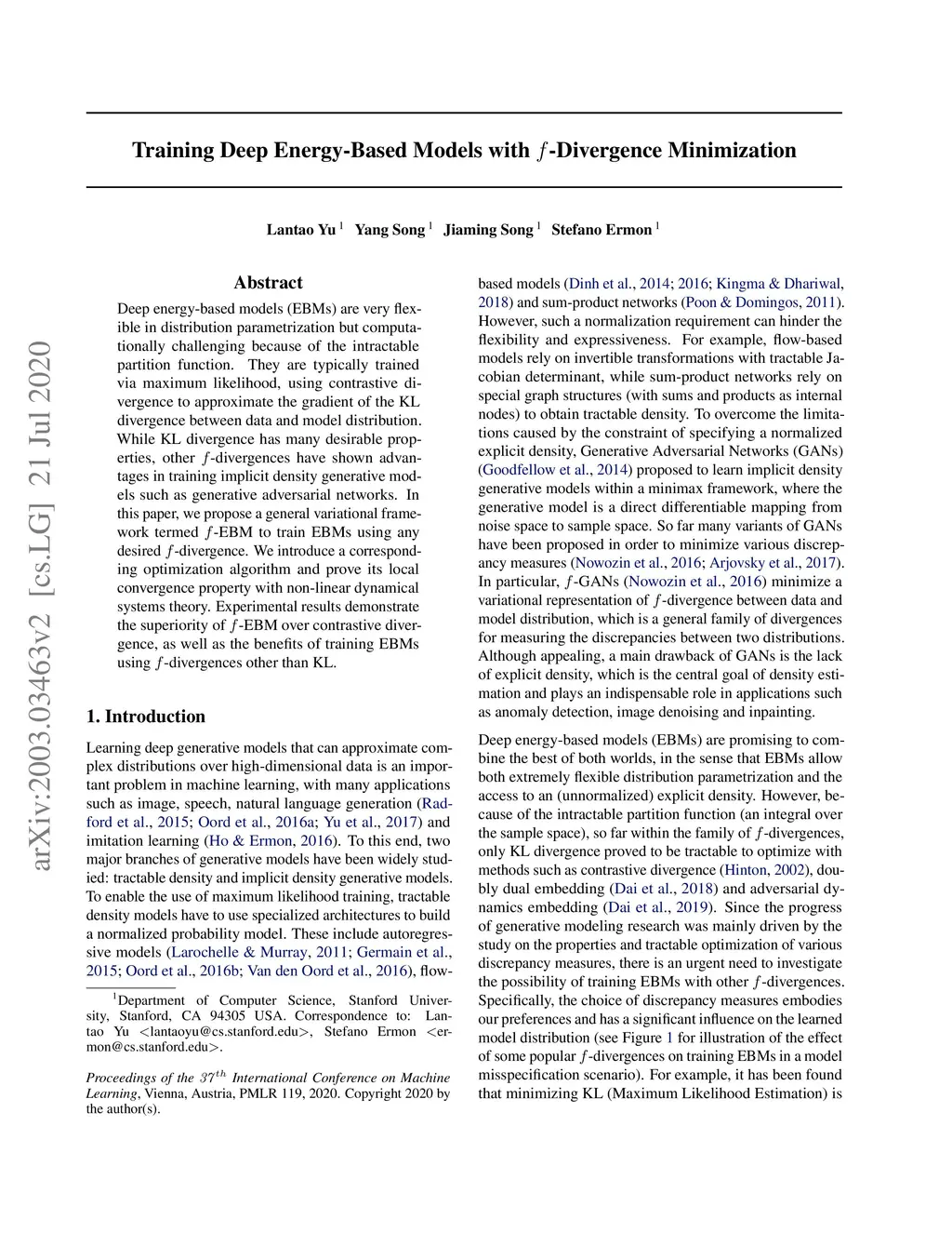 Training Deep Energy-Based Models with f-Divergence Minimization