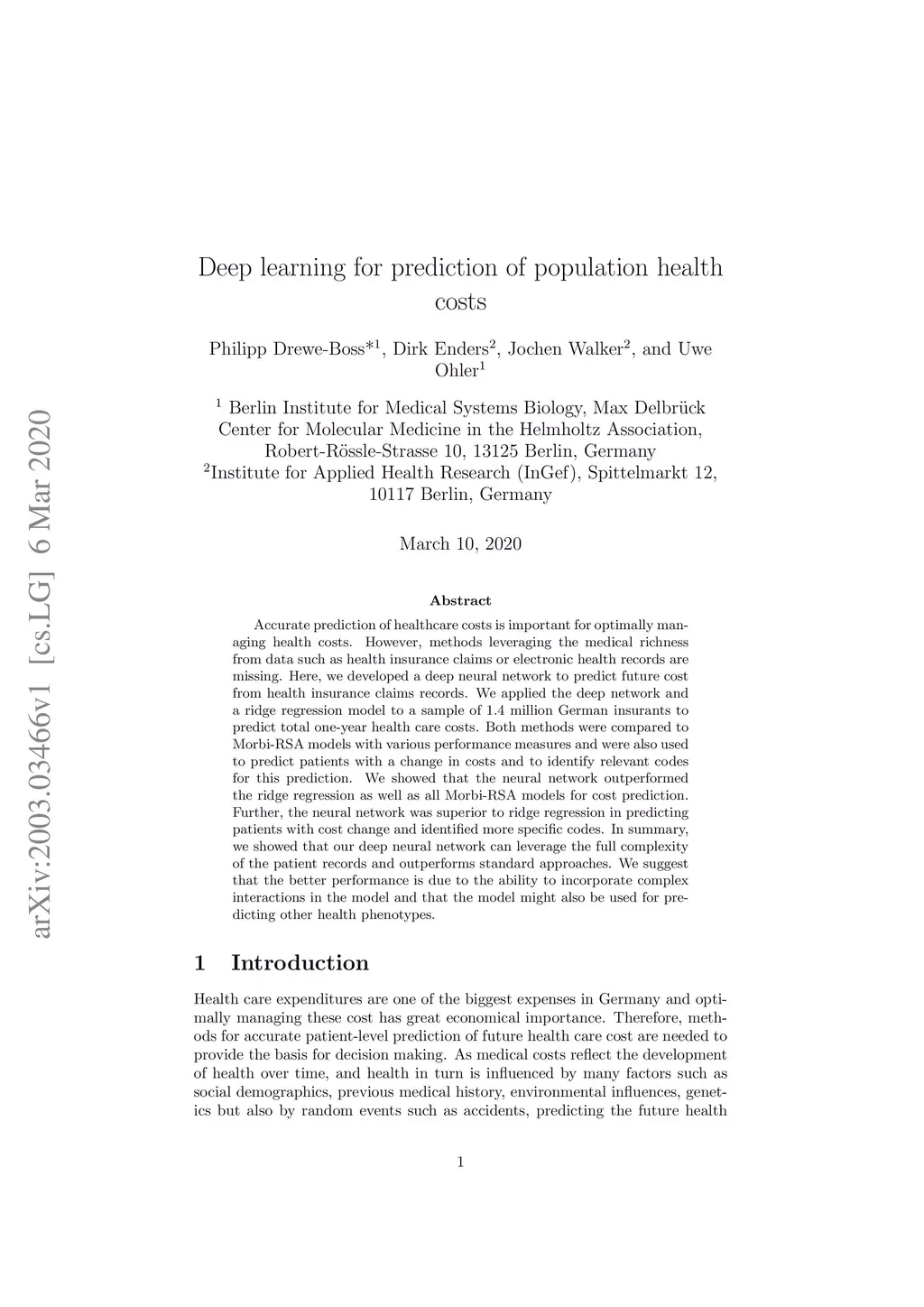 Deep learning for prediction of population health costs