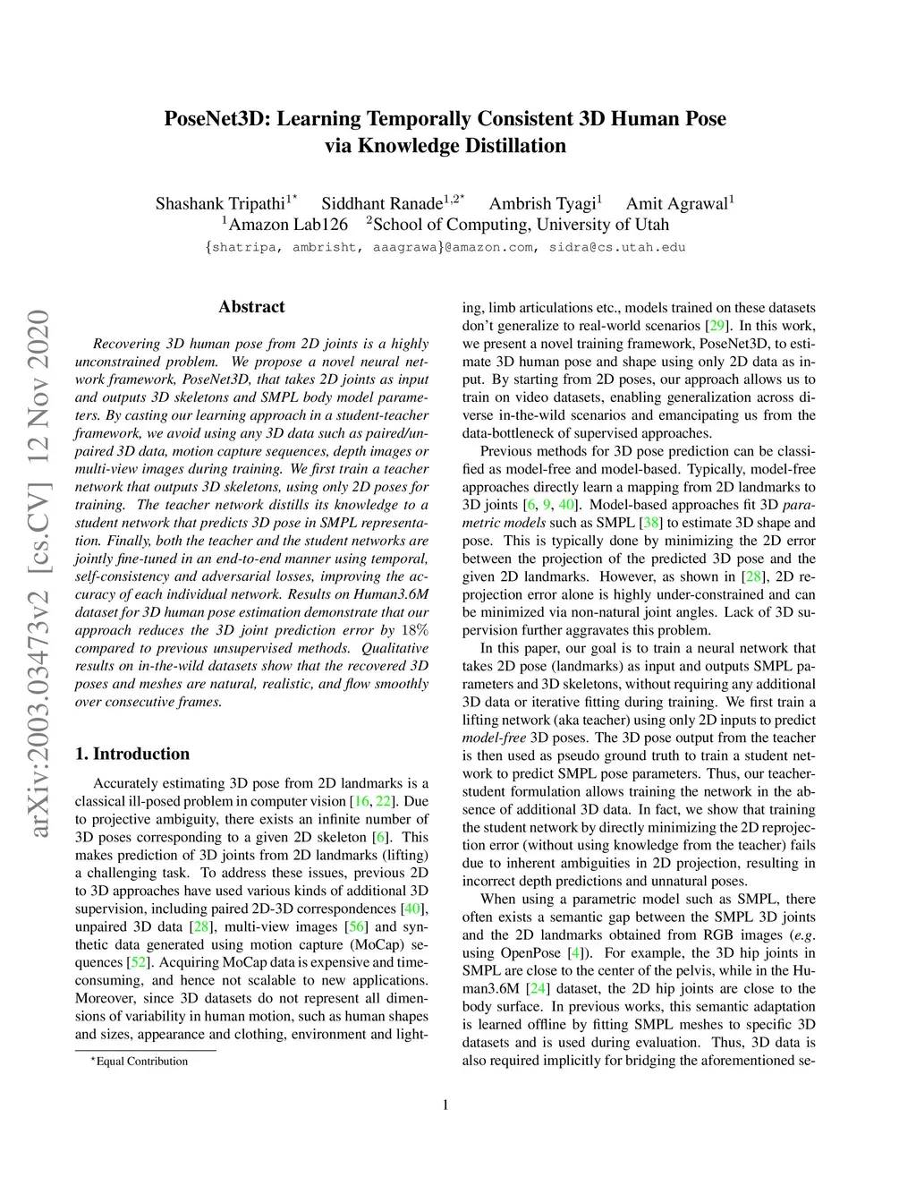 PoseNet3D: Learning Temporally Consistent 3D Human Pose via Knowledge