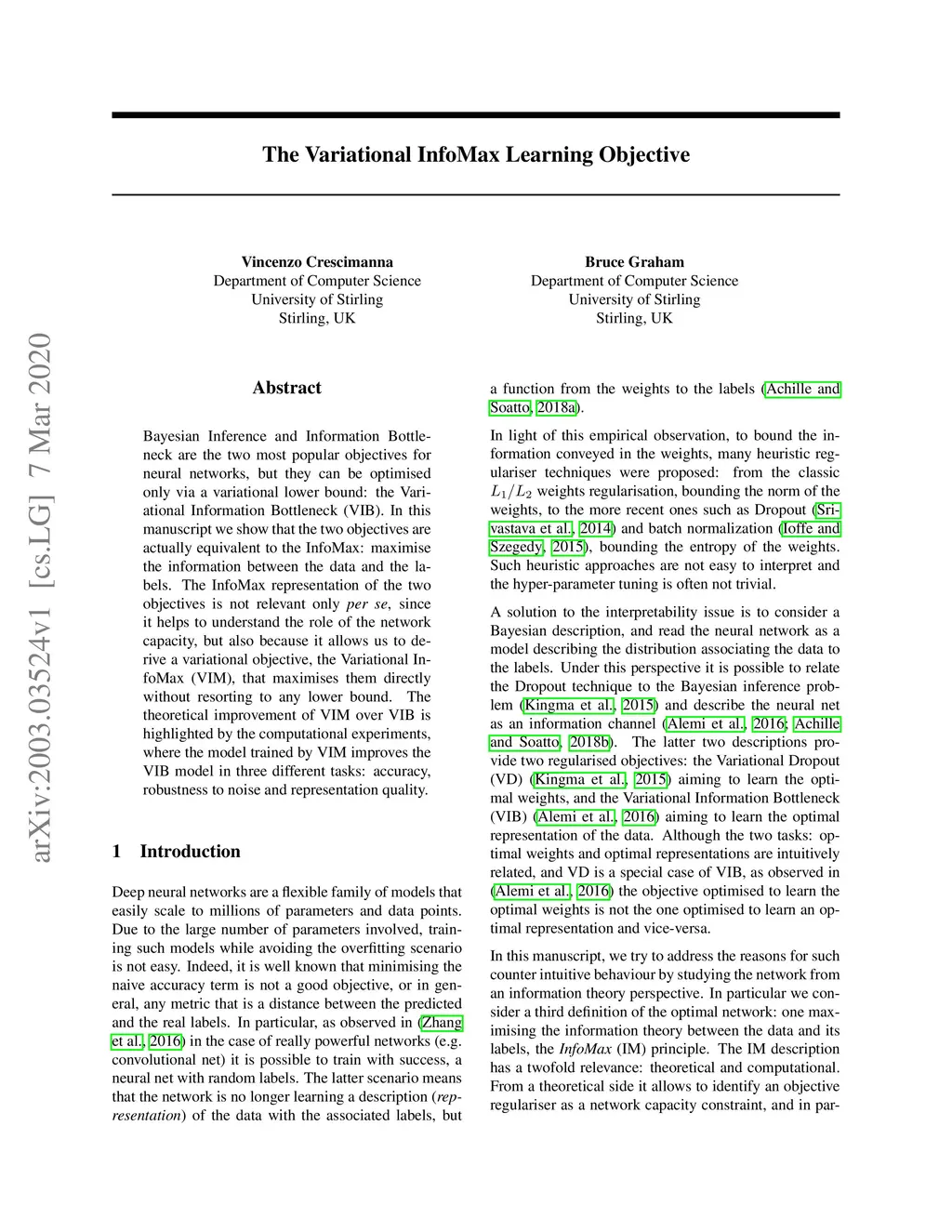 Bayesian Inference and Information Bottleneck are the two most popular objectives for neural networks, but they can be optimised only via a variational lower bound: the Variational Information Bottleneck (VIB). In this manuscript we show that the two objectives are actually equivalent to the InfoMax: maximise the information between the data and the labels. The InfoMax representation of the two objectives is not relevant only per se, since it helps to understand the role of the network capacity, but also because it allows us to derive a variational objective, the Variational InfoMax (VIM), that maximises them directly without resorting to any lower bound. The theoretical improvement of VIM over VIB is highlighted by the computational experiments, where the model trained by VIM improves the VIB model in three different tasks: accuracy, robustness to noise and representation quality.