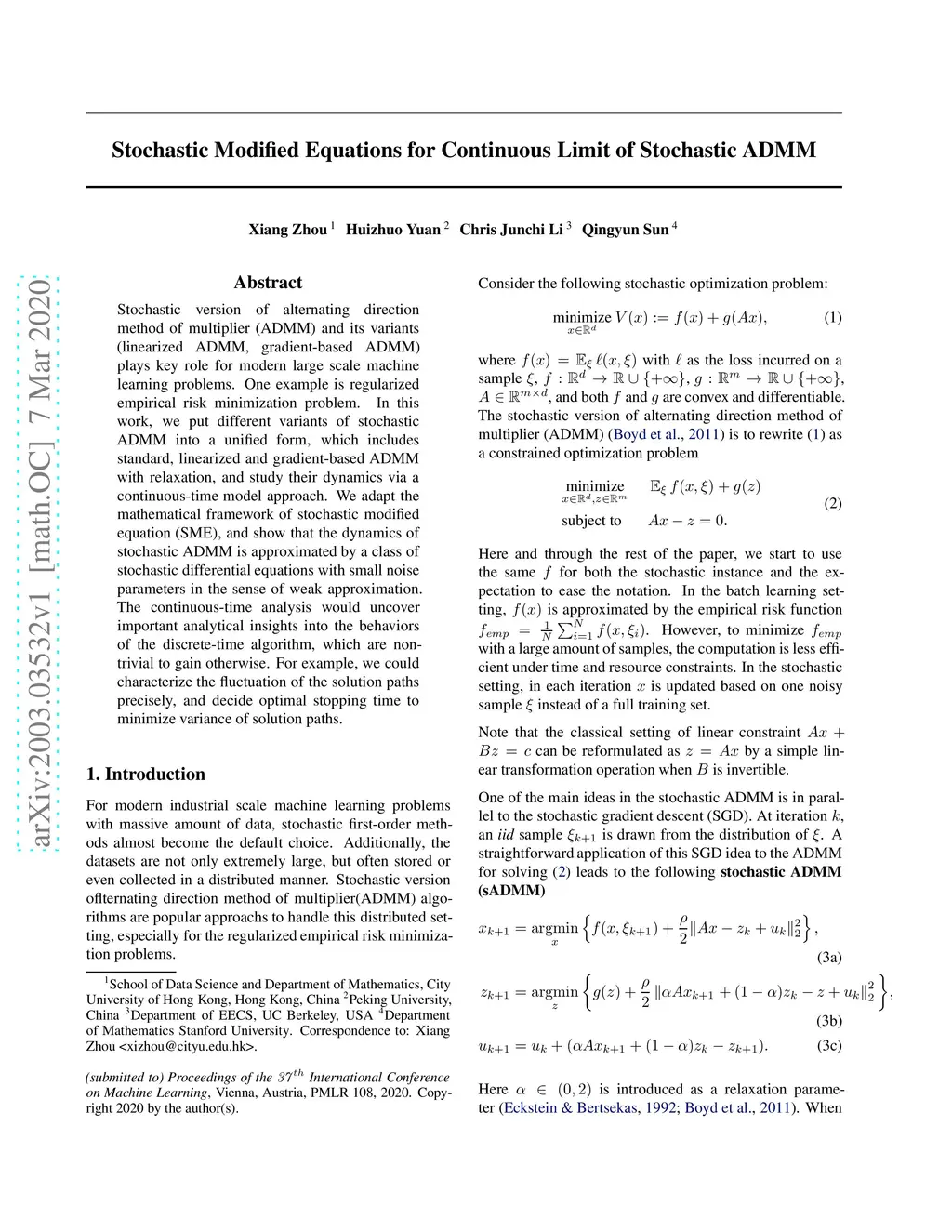 Stochastic Modified Equations for Continuous Limit of Stochastic ADMM