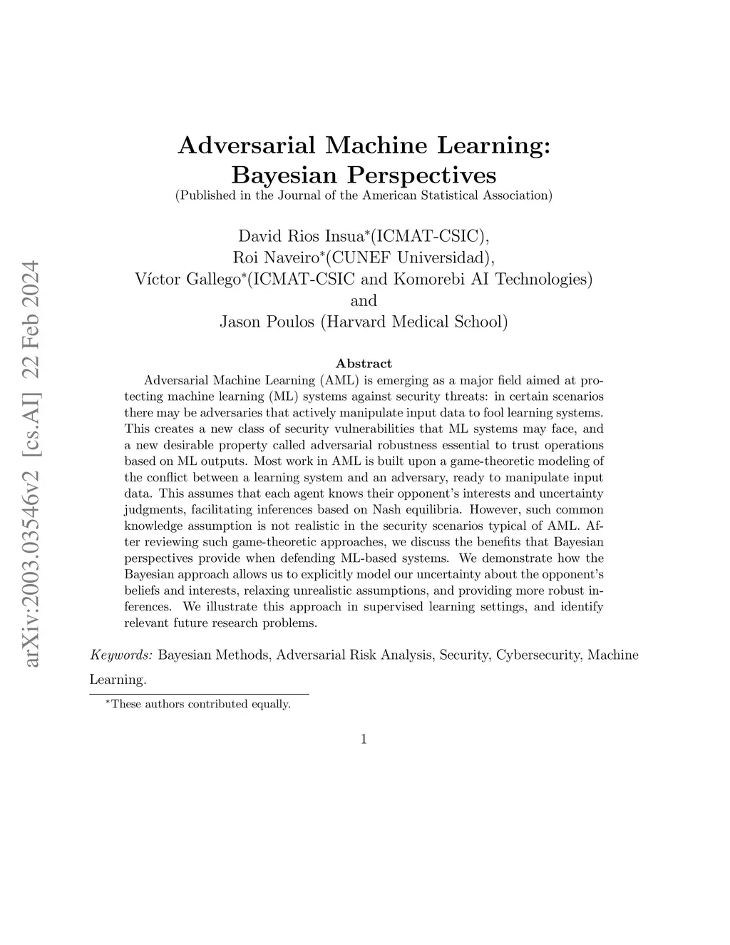 Adversarial Machine Learning: Bayesian Perspectives
