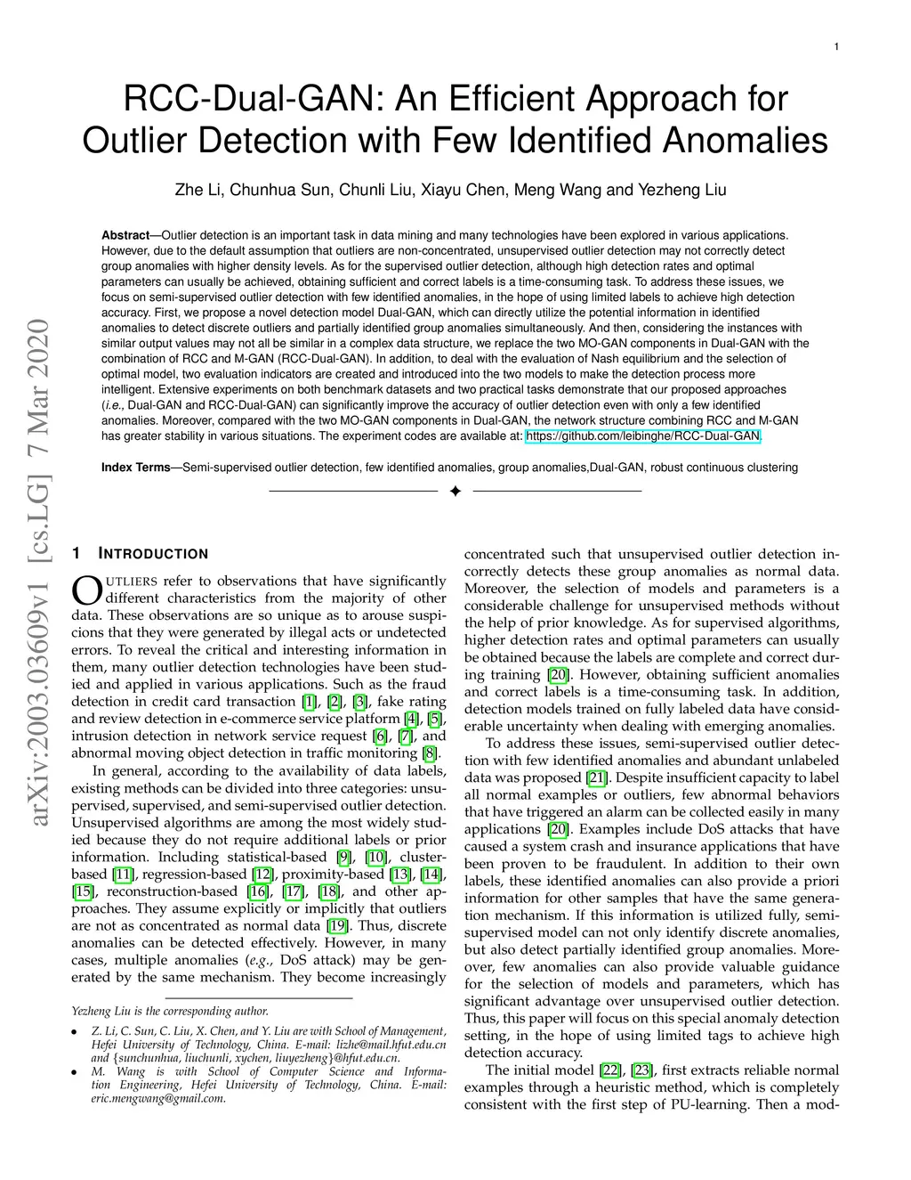 RCC-Dual-GAN: An Efficient Approach for Outlier Detection with Few