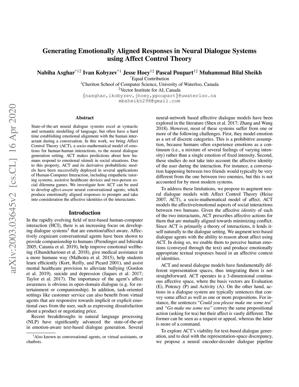 State-of-the-art neural dialogue systems excel at syntactic and semantic modelling of language, but often have a hard time establishing emotional alignment with the human interactant during a conversation. In this work, we bring Affect Control Theory (ACT), a socio-mathematical model of emotions for human-human interactions, to the neural dialogue generation setting. ACT makes predictions about how humans respond to emotional stimuli in social situations. Due to this property, ACT and its derivative probabilistic models have been successfully deployed in several applications of Human-Computer Interaction, including empathetic tutoring systems, assistive healthcare devices and two-person social dilemma games. We investigate how ACT can be used to develop affect-aware neural conversational agents, which produce emotionally aligned responses to prompts and take into consideration the affective identities of the interactants.