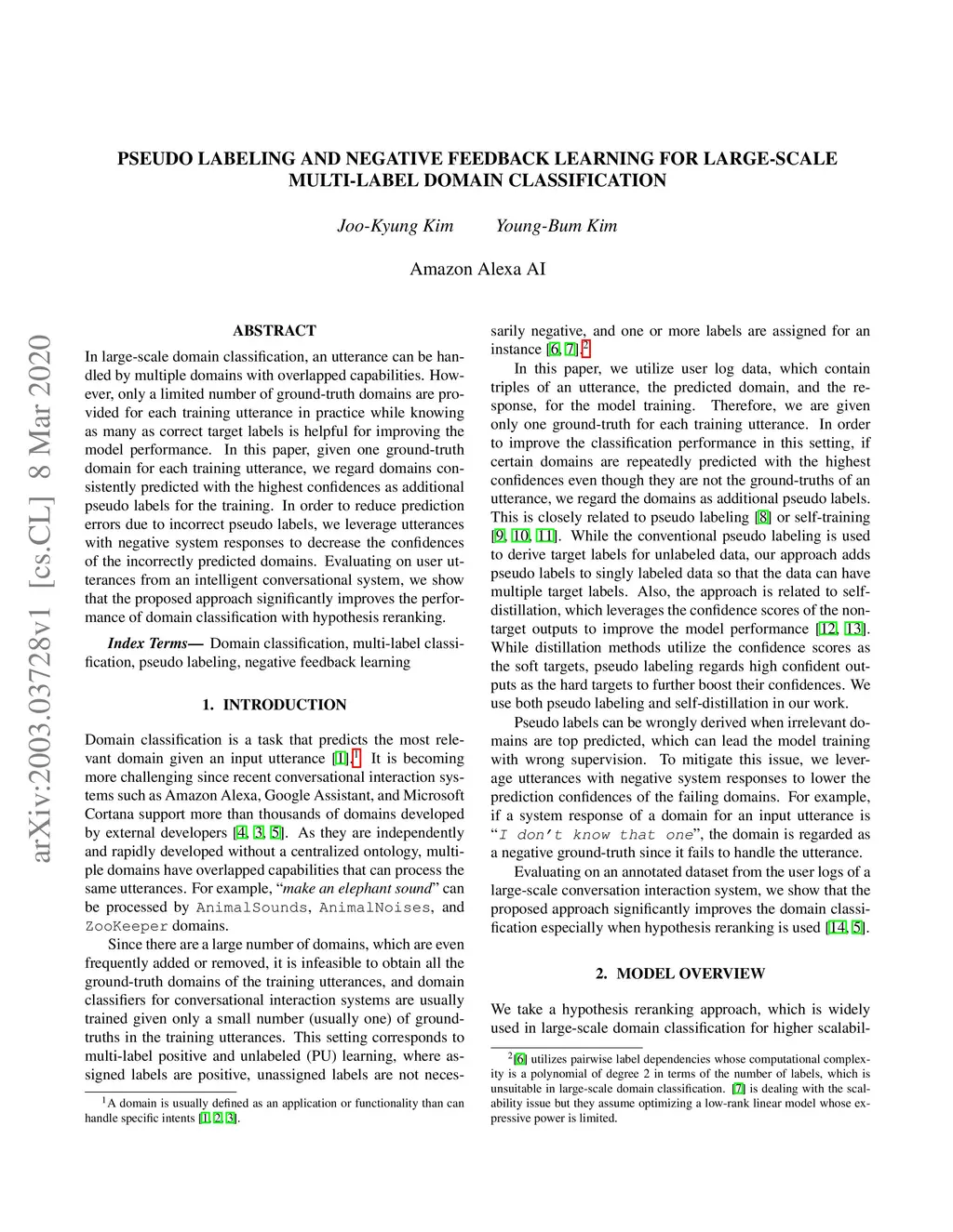 In large-scale domain classification, an utterance can be handled by multiple domains with overlapped capabilities. However, only a limited number of ground-truth domains are provided for each training utterance in practice while knowing as many as correct target labels is helpful for improving the model performance. In this paper, given one ground-truth domain for each training utterance, we regard domains consistently predicted with the highest confidences as additional pseudo labels for the training. In order to reduce prediction errors due to incorrect pseudo labels, we leverage utterances with negative system responses to decrease the confidences of the incorrectly predicted domains. Evaluating on user utterances from an intelligent conversational system, we show that the proposed approach significantly improves the performance of domain classification with hypothesis reranking.