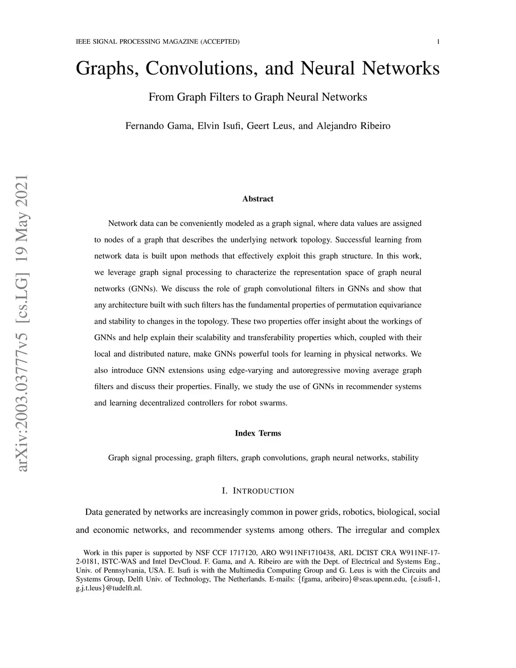 Network data can be conveniently modeled as a graph signal, where data values are assigned to nodes of a graph that describes the underlying network topology. Successful learning from network data is built upon methods that effectively exploit this graph structure. In this work, we leverage graph signal processing to characterize the representation space of graph neural networks (GNNs). We discuss the role of graph convolutional filters in GNNs and show that any architecture built with such filters has the fundamental properties of permutation equivariance and stability to changes in the topology. These two properties offer insight about the workings of GNNs and help explain their scalability and transferability properties which, coupled with their local and distributed nature, make GNNs powerful tools for learning in physical networks. We also introduce GNN extensions using edge-varying and autoregressive moving average graph filters and discuss their properties. Finally, we study the use of GNNs in recommender systems and learning decentralized controllers for robot swarms.