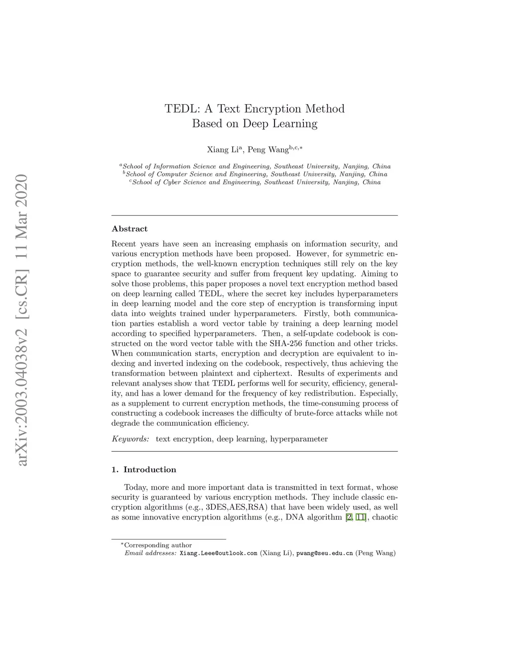 TEDL: A Text Encryption Method Based on Deep Learning