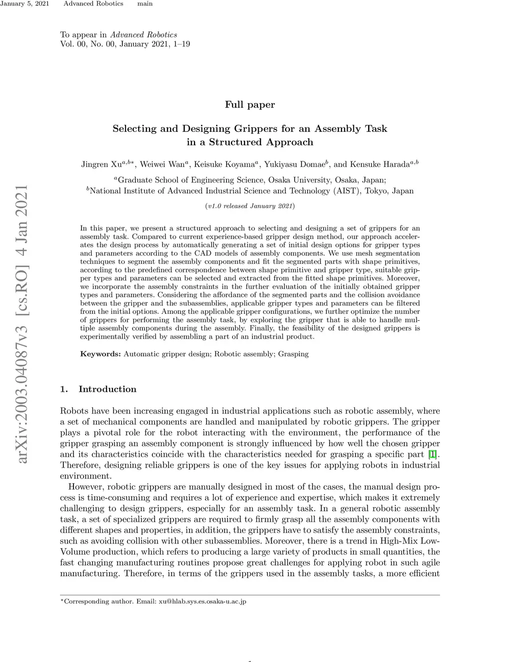 Selecting and Designing Grippers for an Assembly Task in a Structured