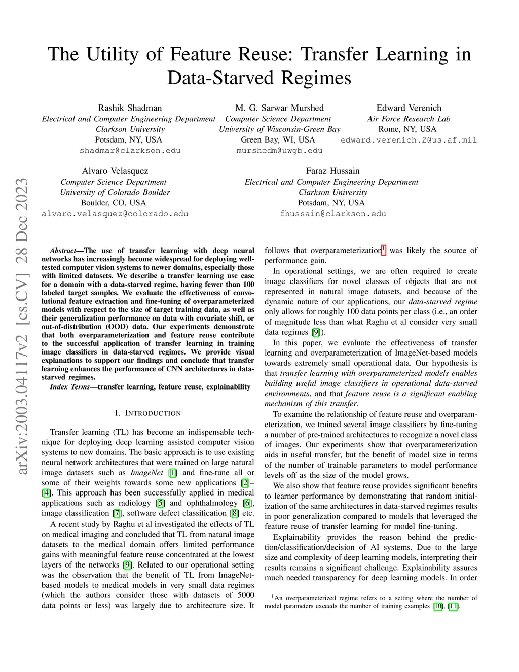 The use of transfer learning with deep neural networks has increasingly become widespread for deploying well-tested computer vision systems to newer domains, especially those with limited datasets. We describe a transfer learning use case for a domain with a data-starved regime, having fewer than 100 labeled target samples. We evaluate the effectiveness of convolutional feature extraction and fine-tuning of overparameterized models with respect to the size of target training data, as well as their generalization performance on data with covariate shift, or out-of-distribution (OOD) data. Our experiments demonstrate that both overparameterization and feature reuse contribute to the successful application of transfer learning in training image classifiers in data-starved regimes. We provide visual explanations to support our findings and conclude that transfer learning enhances the performance of CNN architectures in data-starved regimes.