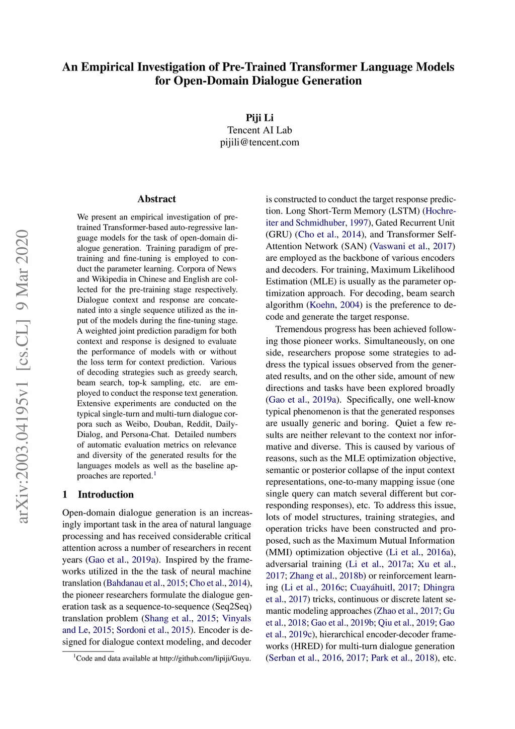 We present an empirical investigation of pre-trained Transformer-based auto-regressive language models for the task of open-domain dialogue generation. Training paradigm of pre-training and fine-tuning is employed to conduct the parameter learning. Corpora of News and Wikipedia in Chinese and English are collected for the pre-training stage respectively. Dialogue context and response are concatenated into a single sequence utilized as the input of the models during the fine-tuning stage. A weighted joint prediction paradigm for both context and response is designed to evaluate the performance of models with or without the loss term for context prediction. Various of decoding strategies such as greedy search, beam search, top-k sampling, etc. are employed to conduct the response text generation. Extensive experiments are conducted on the typical single-turn and multi-turn dialogue corpora such as Weibo, Douban, Reddit, DailyDialog, and Persona-Chat. Detailed numbers of automatic evaluation metrics on relevance and diversity of the generated results for the languages models as well as the baseline approaches are reported.