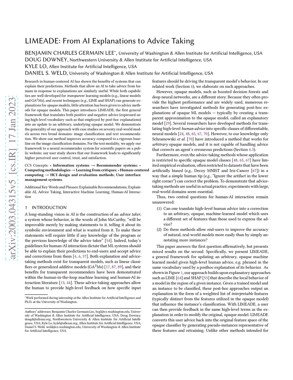 Research in human-centered AI has shown the benefits of systems that can explain their predictions. Methods that allow an AI to take advice from humans in response to explanations are similarly useful. While both capabilities are well-developed for transparent learning models (e.g., linear models and GAMs), and recent techniques (e.g., LIME and SHAP) can generate explanations for opaque models, little attention has been given to advice methods for opaque models. This paper introduces LIMEADE, the first general framework that translates both positive and negative advice (expressed using high-level vocabulary such as that employed by post-hoc explanations) into an update to an arbitrary, underlying opaque model. We demonstrate the generality of our approach with case studies on seventy real-world models across two broad domains: image classification and text recommendation. We show our method improves accuracy compared to a rigorous baseline on the image classification domains. For the text modality, we apply our framework to a neural recommender system for scientific papers on a public website; our user study shows that our framework leads to significantly higher perceived user control, trust, and satisfaction.