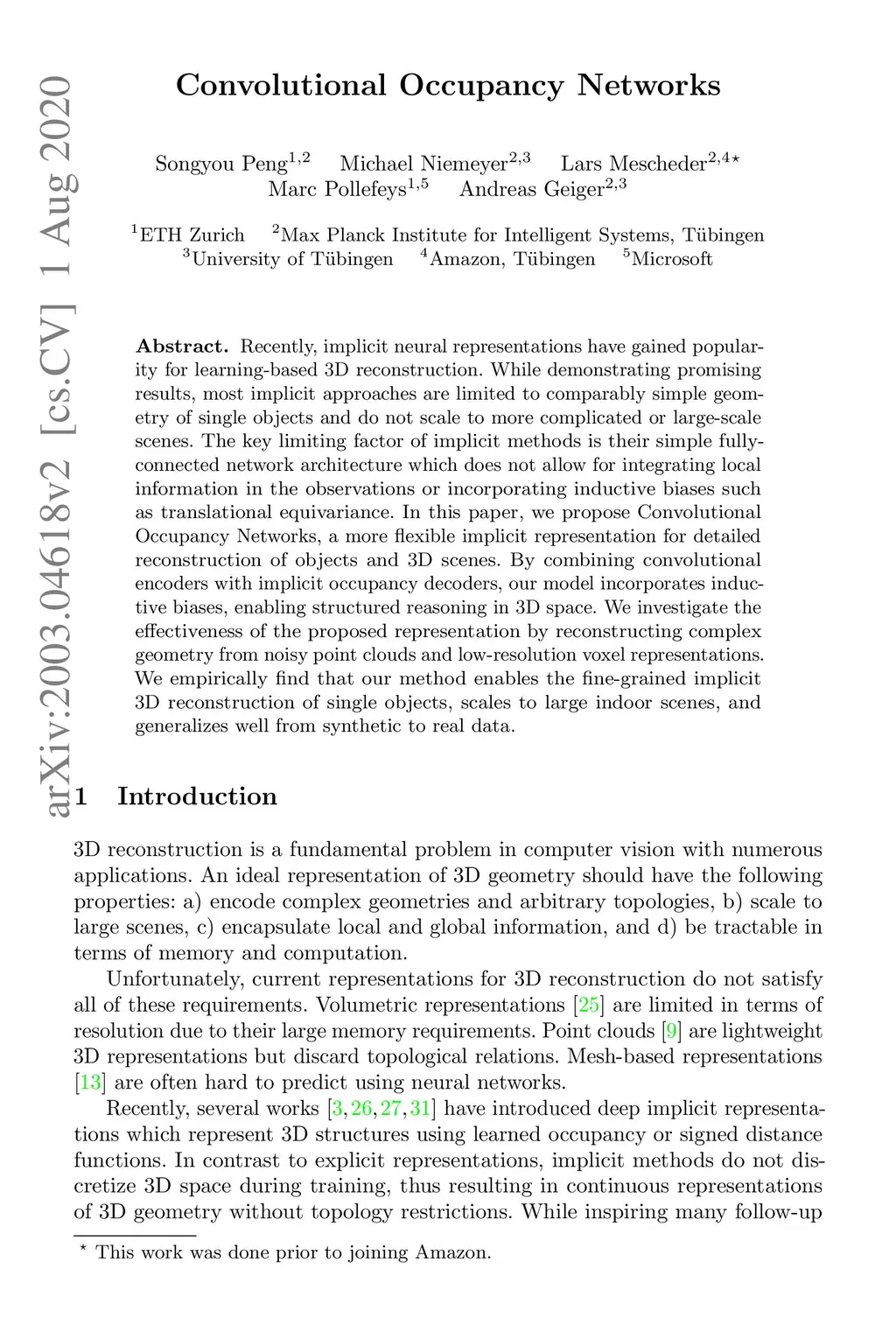 Recently, implicit neural representations have gained popularity for learning-based 3D reconstruction. While demonstrating promising results, most implicit approaches are limited to comparably simple geometry of single objects and do not scale to more complicated or large-scale scenes. The key limiting factor of implicit methods is their simple fully-connected network architecture which does not allow for integrating local information in the observations or incorporating inductive biases such as translational equivariance. In this paper, we propose Convolutional Occupancy Networks, a more flexible implicit representation for detailed reconstruction of objects and 3D scenes. By combining convolutional encoders with implicit occupancy decoders, our model incorporates inductive biases, enabling structured reasoning in 3D space. We investigate the effectiveness of the proposed representation by reconstructing complex geometry from noisy point clouds and low-resolution voxel representations. We empirically find that our method enables the fine-grained implicit 3D reconstruction of single objects, scales to large indoor scenes, and generalizes well from synthetic to real data.