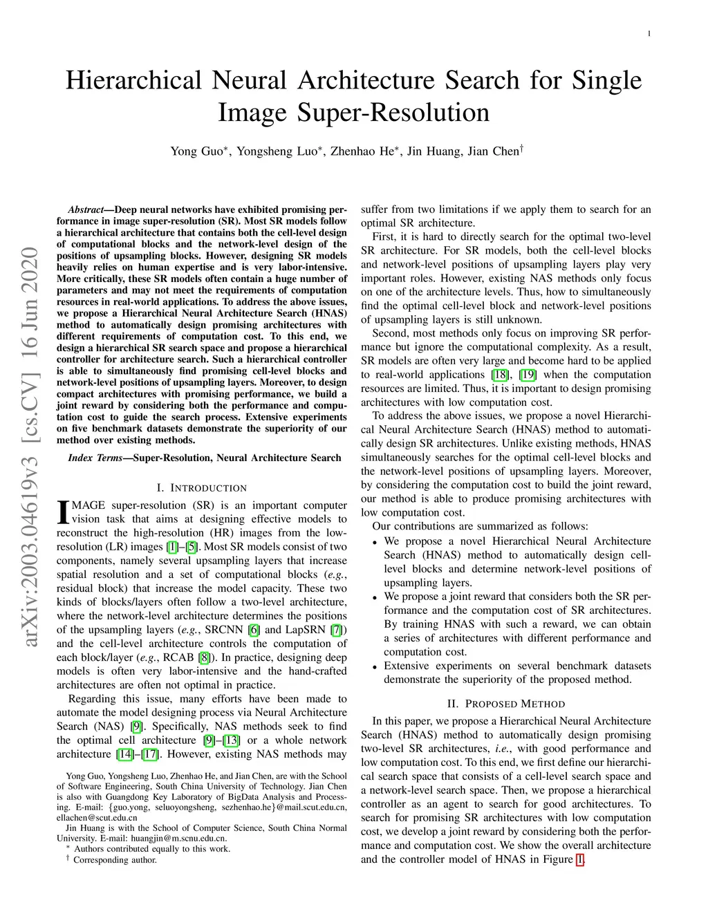 Deep neural networks have exhibited promising performance in image super-resolution (SR). Most SR models follow a hierarchical architecture that contains both the cell-level design of computational blocks and the network-level design of the positions of upsampling blocks. However, designing SR models heavily relies on human expertise and is very labor-intensive. More critically, these SR models often contain a huge number of parameters and may not meet the requirements of computation resources in real-world applications. To address the above issues, we propose a Hierarchical Neural Architecture Search (HNAS) method to automatically design promising architectures with different requirements of computation cost. To this end, we design a hierarchical SR search space and propose a hierarchical controller for architecture search. Such a hierarchical controller is able to simultaneously find promising cell-level blocks and network-level positions of upsampling layers. Moreover, to design compact architectures with promising performance, we build a joint reward by considering both the performance and computation cost to guide the search process. Extensive experiments on five benchmark datasets demonstrate the superiority of our method over existing methods.