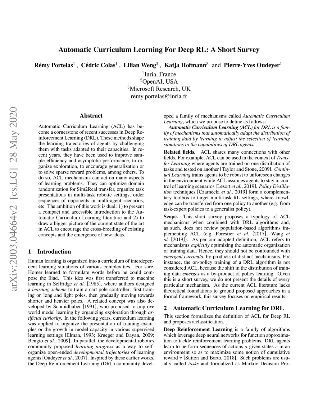 Automatic Curriculum Learning For Deep RL: A Short Survey
