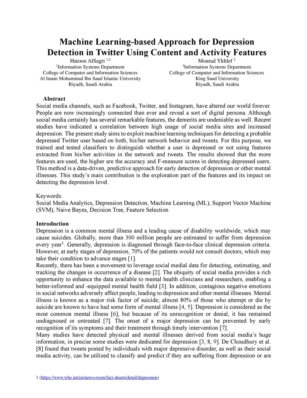 Machine Learning-based Approach for Depression Detection in Twitter