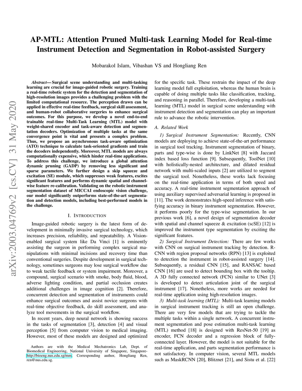 Surgical scene understanding and multi-tasking learning are crucial for image-guided robotic surgery. Training a real-time robotic system for the detection and segmentation of high-resolution images provides a challenging problem with the limited computational resource. The perception drawn can be applied in effective real-time feedback, surgical skill assessment, and human-robot collaborative surgeries to enhance surgical outcomes. For this purpose, we develop a novel end-to-end trainable real-time Multi-Task Learning (MTL) model with weight-shared encoder and task-aware detection and segmentation decoders. Optimization of multiple tasks at the same convergence point is vital and presents a complex problem. Thus, we propose an asynchronous task-aware optimization (ATO) technique to calculate task-oriented gradients and train the decoders independently. Moreover, MTL models are always computationally expensive, which hinder real-time applications. To address this challenge, we introduce a global attention dynamic pruning (GADP) by removing less significant and sparse parameters. We further design a skip squeeze and excitation (SE) module, which suppresses weak features, excites significant features and performs dynamic spatial and channel-wise feature re-calibration. Validating on the robotic instrument segmentation dataset of MICCAI endoscopic vision challenge, our model significantly outperforms state-of-the-art segmentation and detection models, including best-performed models in the challenge.