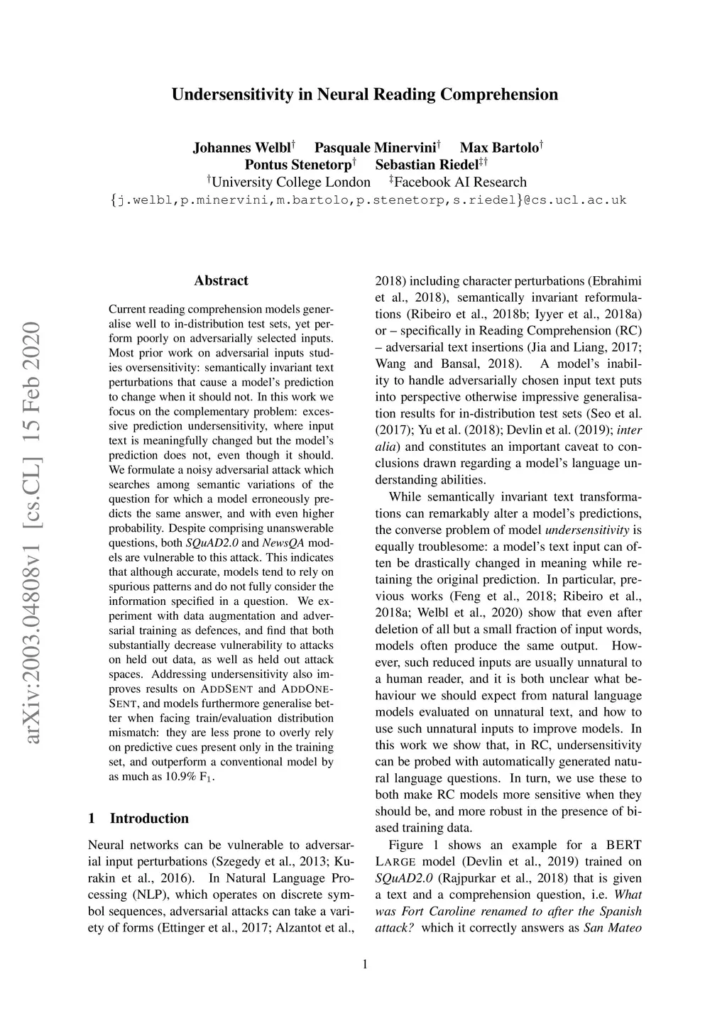 Current reading comprehension models generalise well to in-distribution test sets, yet perform poorly on adversarially selected inputs. Most prior work on adversarial inputs studies oversensitivity: semantically invariant text perturbations that cause a model's prediction to change when it should not. In this work we focus on the complementary problem: excessive prediction undersensitivity, where input text is meaningfully changed but the model's prediction does not, even though it should. We formulate a noisy adversarial attack which searches among semantic variations of the question for which a model erroneously predicts the same answer, and with even higher probability. Despite comprising unanswerable questions, both SQuAD2.0 and NewsQA models are vulnerable to this attack. This indicates that although accurate, models tend to rely on spurious patterns and do not fully consider the information specified in a question. We experiment with data augmentation and adversarial training as defences, and find that both substantially decrease vulnerability to attacks on held out data, as well as held out attack spaces. Addressing undersensitivity also improves results on AddSent and AddOneSent, and models furthermore generalise better when facing train/evaluation distribution mismatch: they are less prone to overly rely on predictive cues present only in the training set, and outperform a conventional model by as much as 10.9% F1.