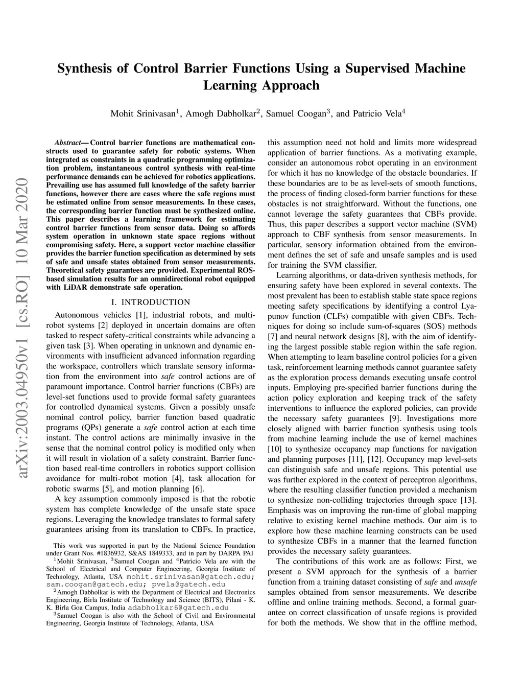 Control barrier functions are mathematical constructs used to guarantee safety for robotic systems. When integrated as constraints in a quadratic programming optimization problem, instantaneous control synthesis with real-time performance demands can be achieved for robotics applications. Prevailing use has assumed full knowledge of the safety barrier functions, however there are cases where the safe regions must be estimated online from sensor measurements. In these cases, the corresponding barrier function must be synthesized online. This paper describes a learning framework for estimating control barrier functions from sensor data. Doing so affords system operation in unknown state space regions without compromising safety. Here, a support vector machine classifier provides the barrier function specification as determined by sets of safe and unsafe states obtained from sensor measurements. Theoretical safety guarantees are provided. Experimental ROS-based simulation results for an omnidirectional robot equipped with LiDAR demonstrate safe operation.